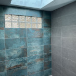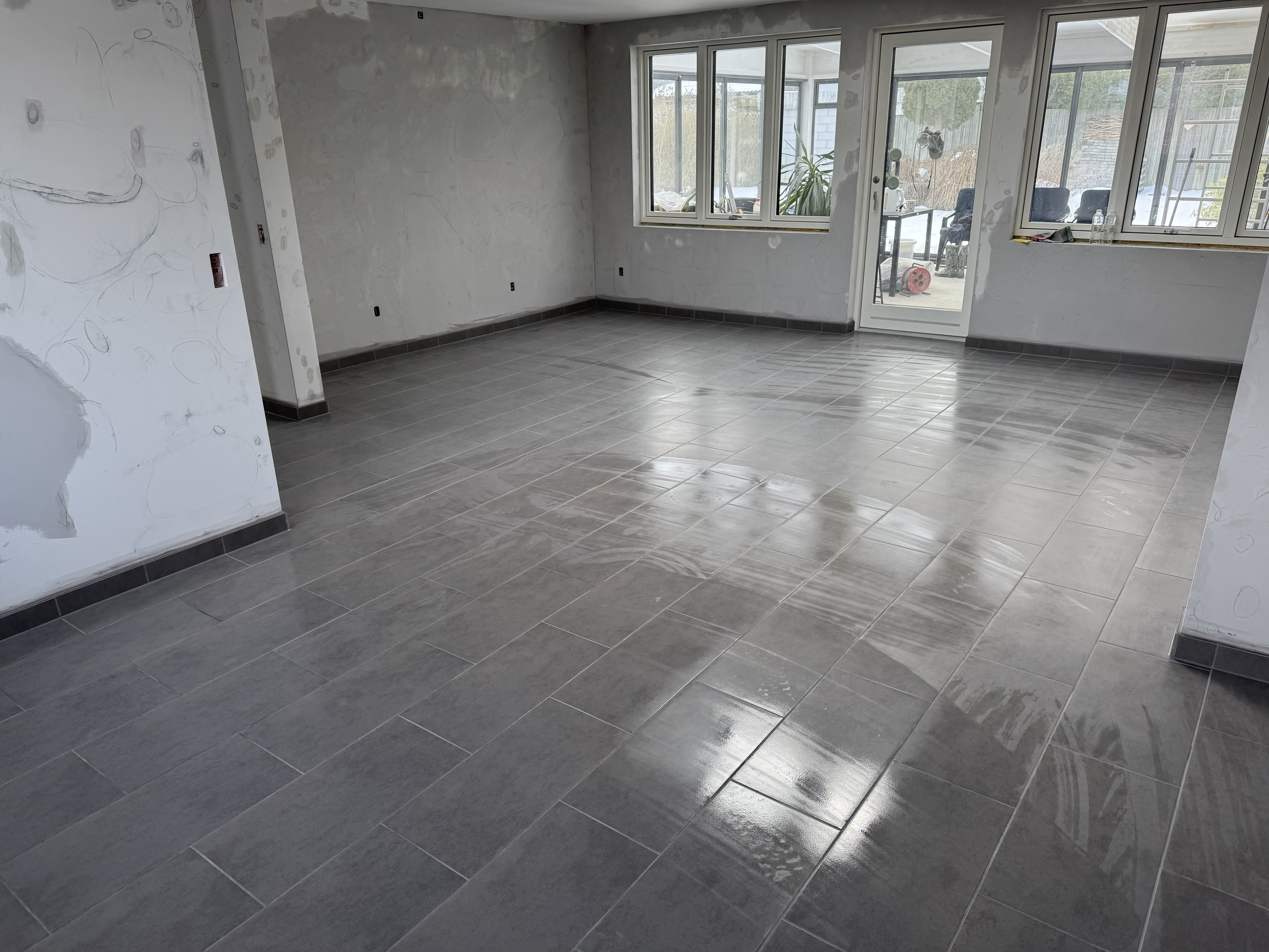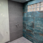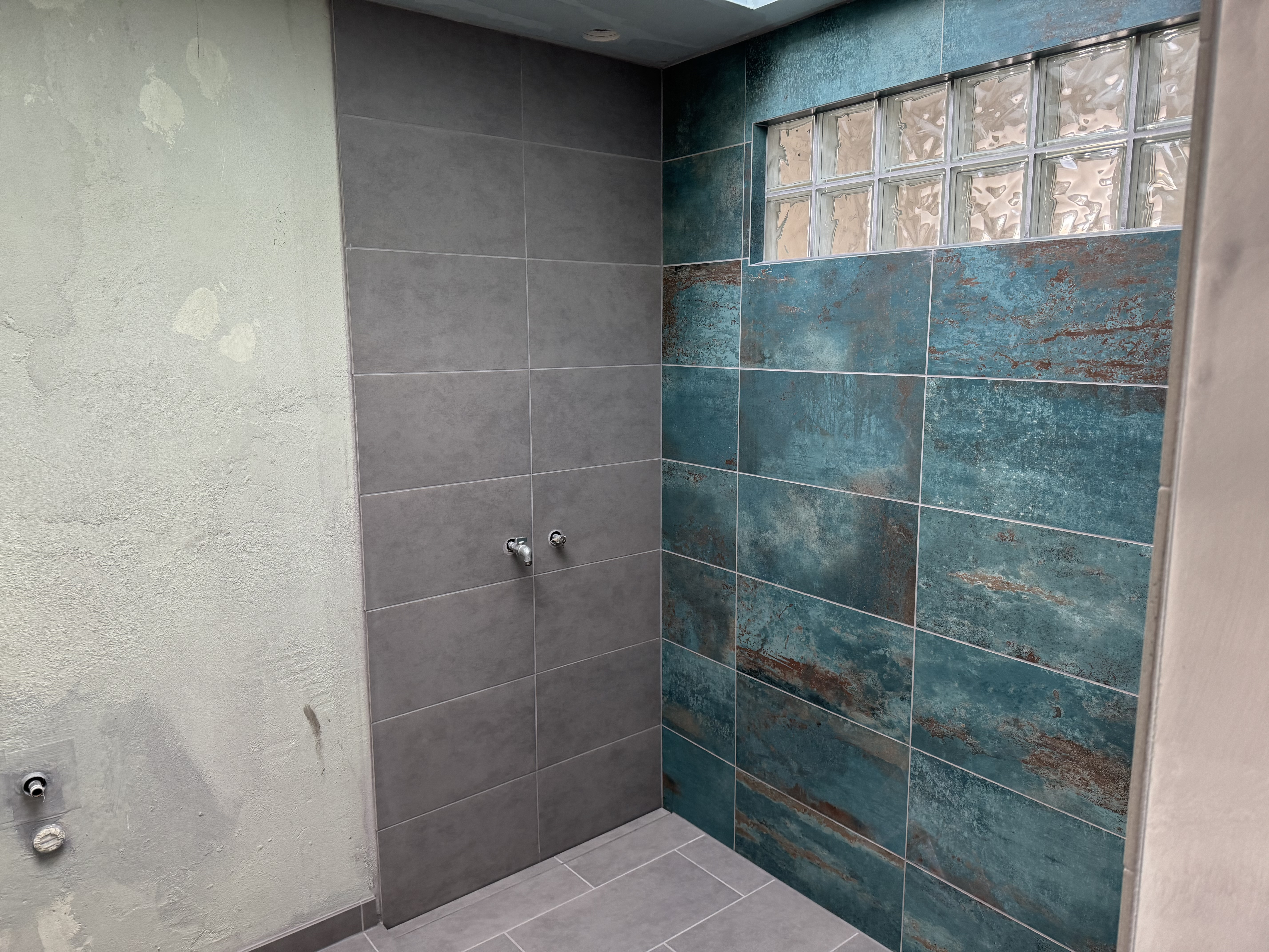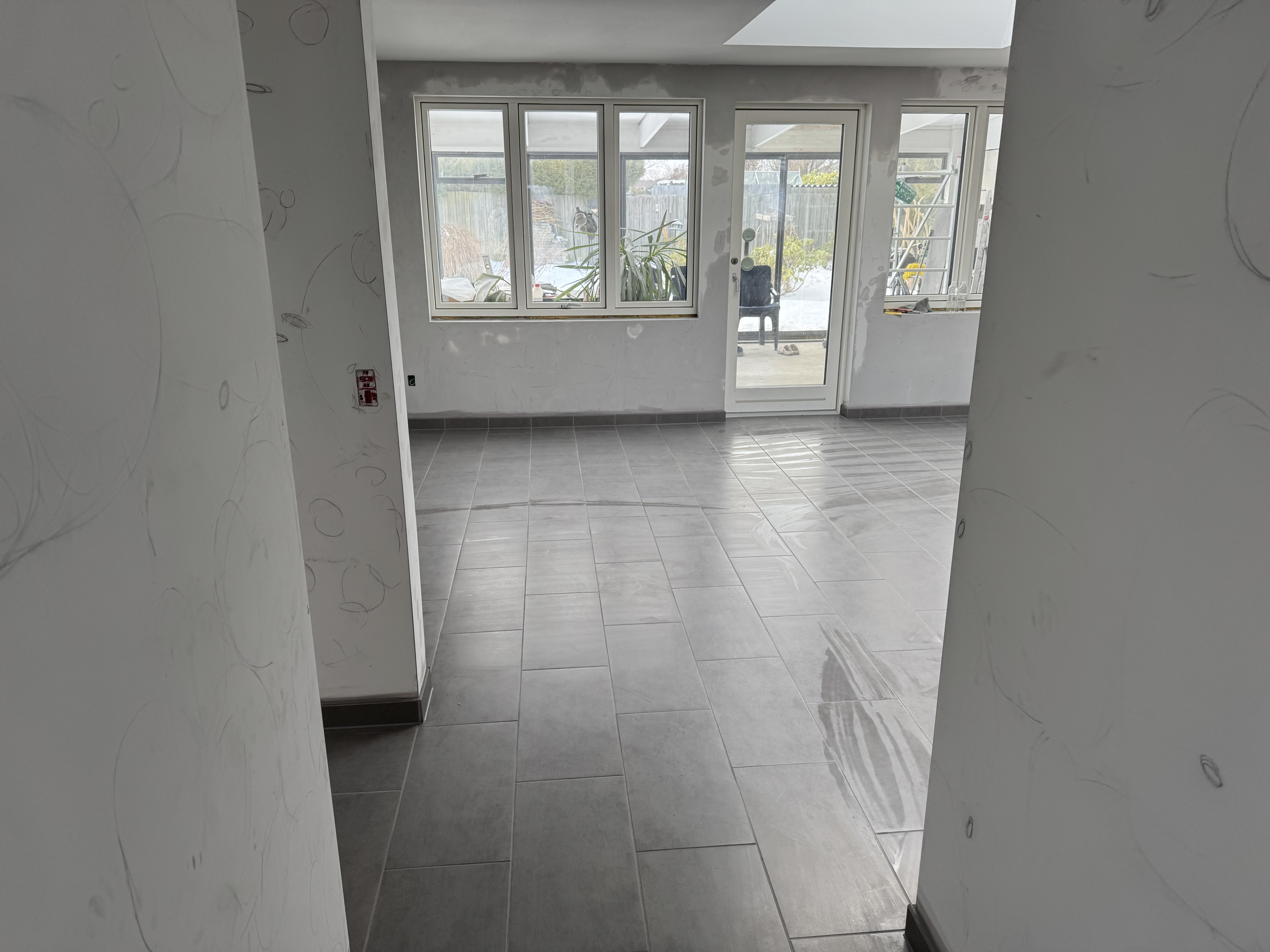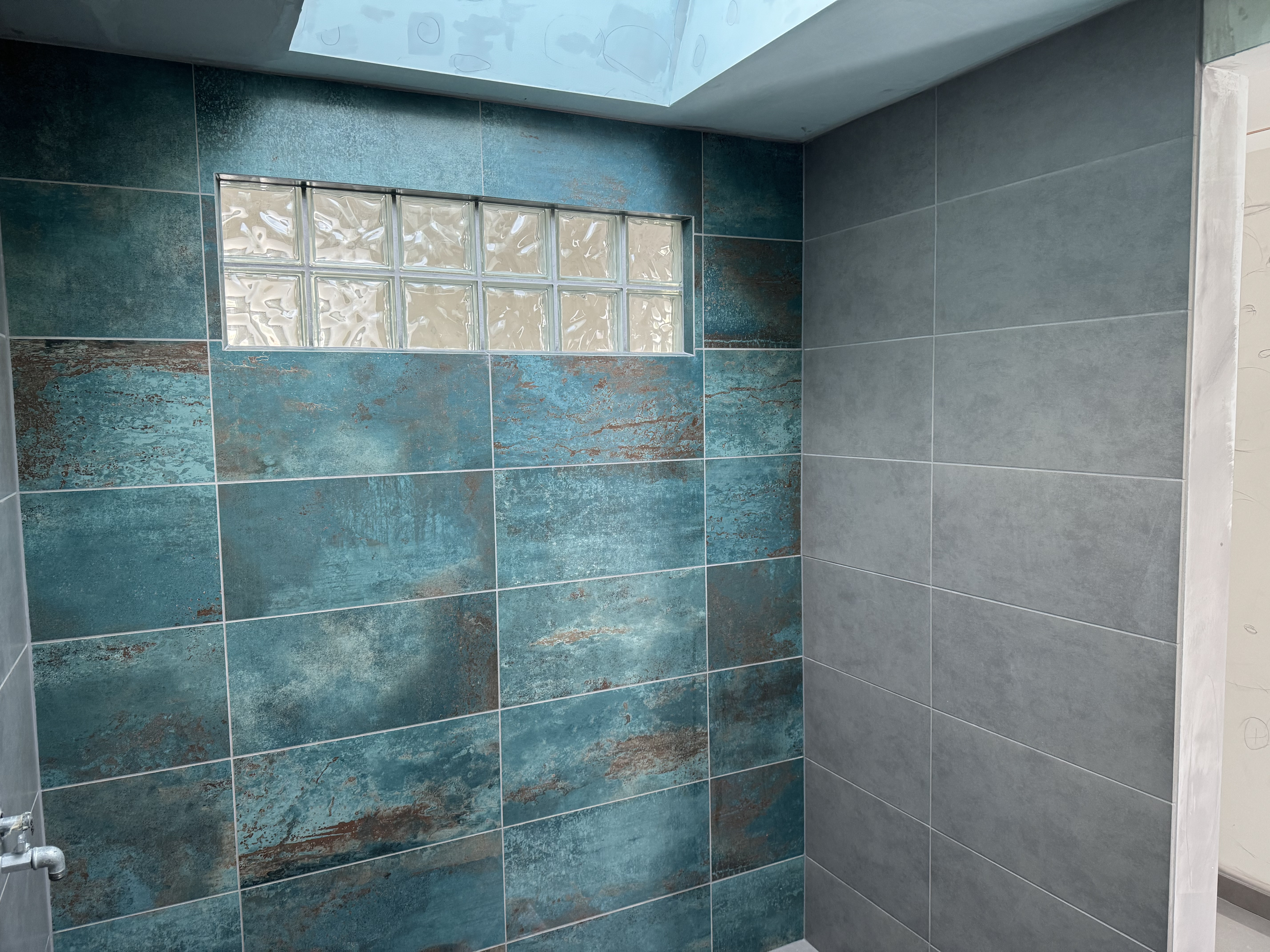 Fliser 6x600x1200mm opsat snor lige, på skæve vægge, der også skulle oprettes! Og med en flot 3mm fuge på gulv & vægge, der også flugter snor lige.