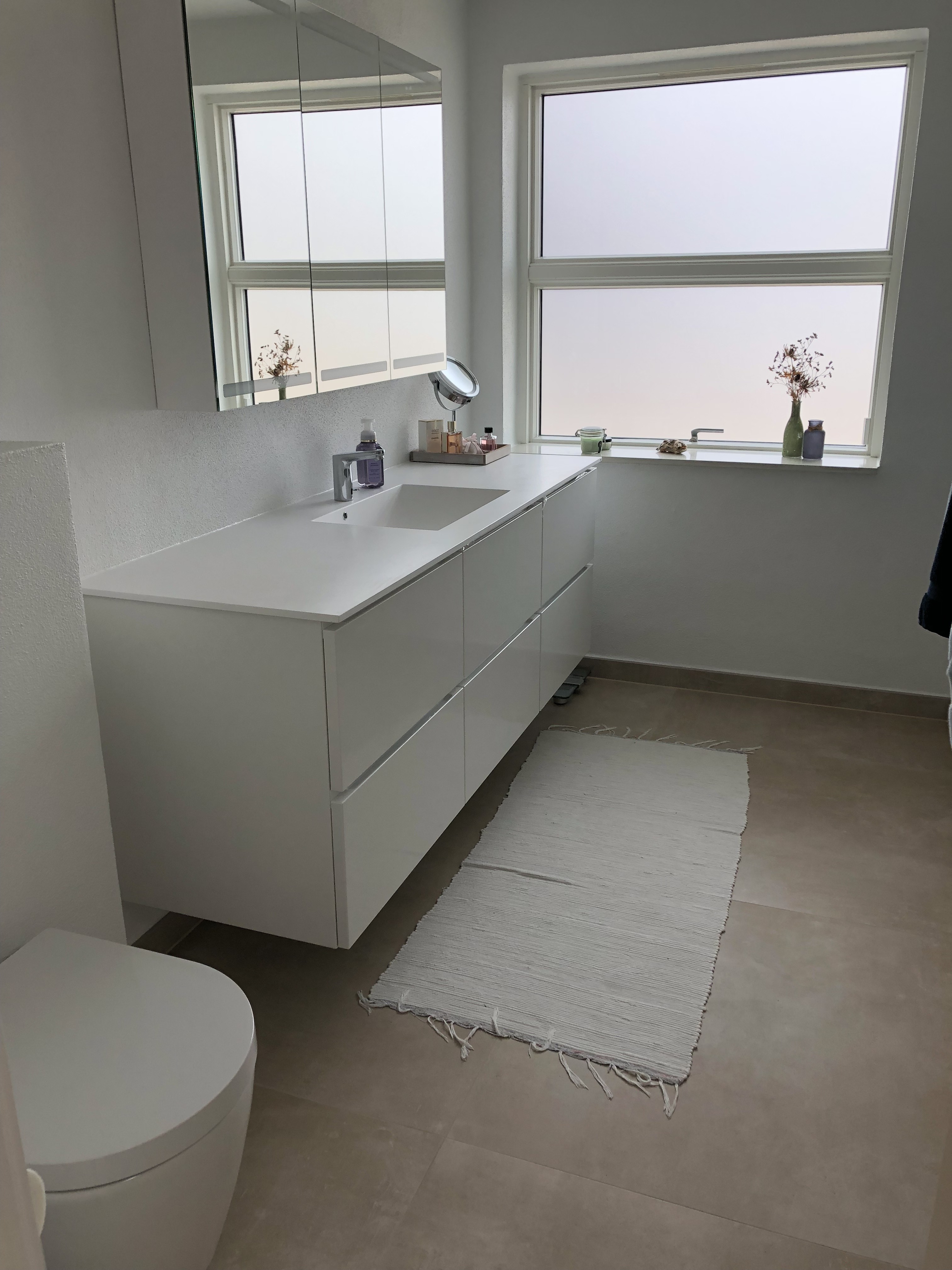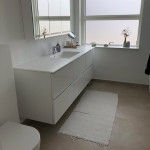 Nuværende fliser på vægge og gulv fjernet. Vægge rettet op og pudset. Fliser sat op i brusekabine og på gulv.