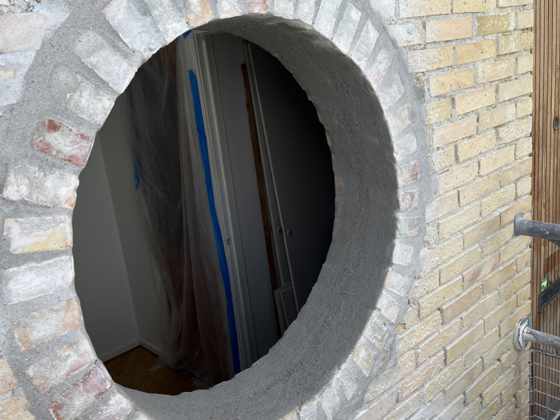 Demontering af eksisterende dør, Åbning af dørhul i højre side, Puds af false. Alt blev lavet efter aftale og til tiden.