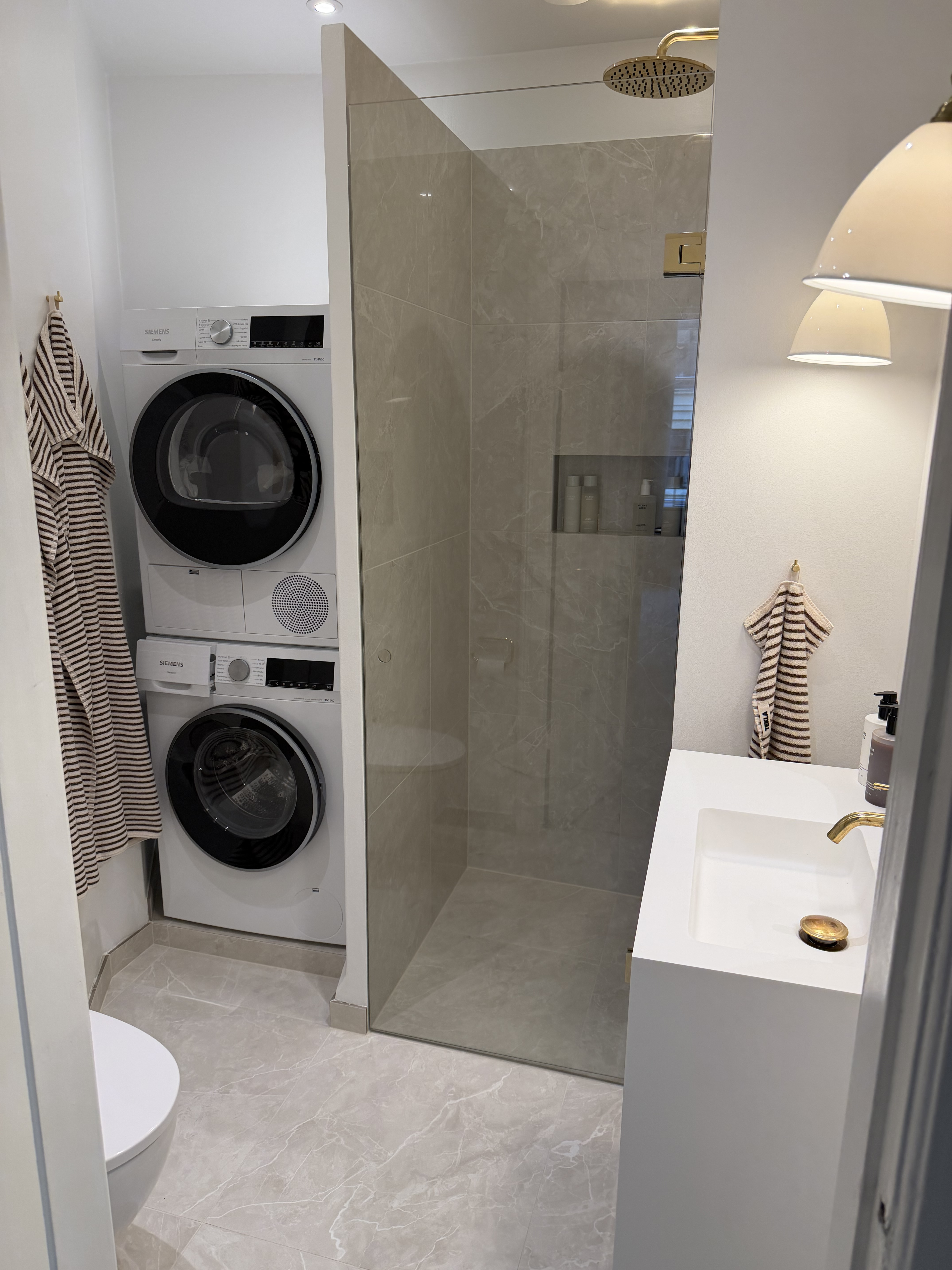 Gazmir byggede vores badeværelse på ca. 4kvm i København fra bunden. Vi ønskede at optimere rummet så meget som muligt med både god størrelse bruseniche, vaskesøjle, toilet og håndvask, samt plads til at vende og dreje. Oveni det ønskede vi gulvvarme i hele gulvet.