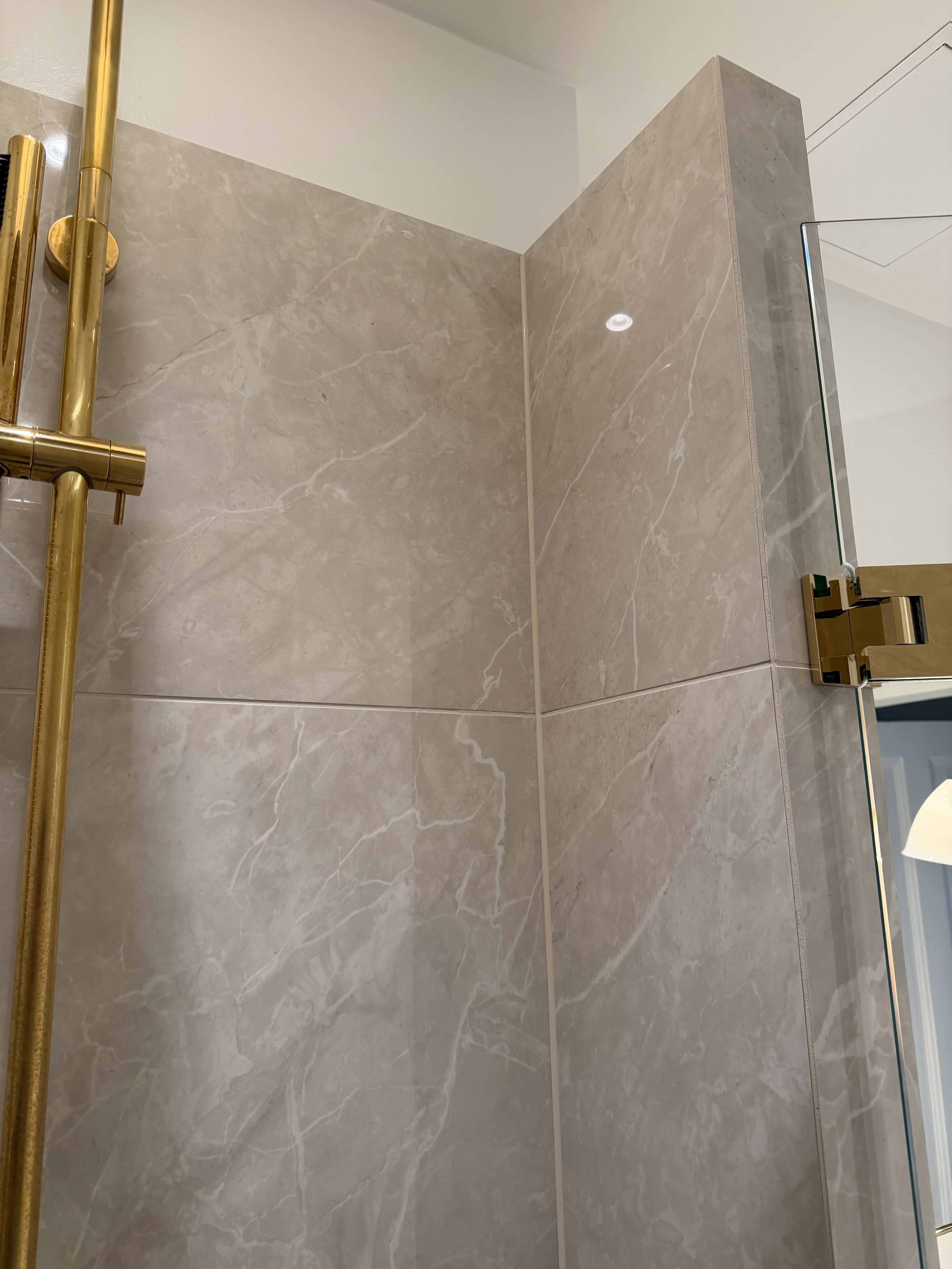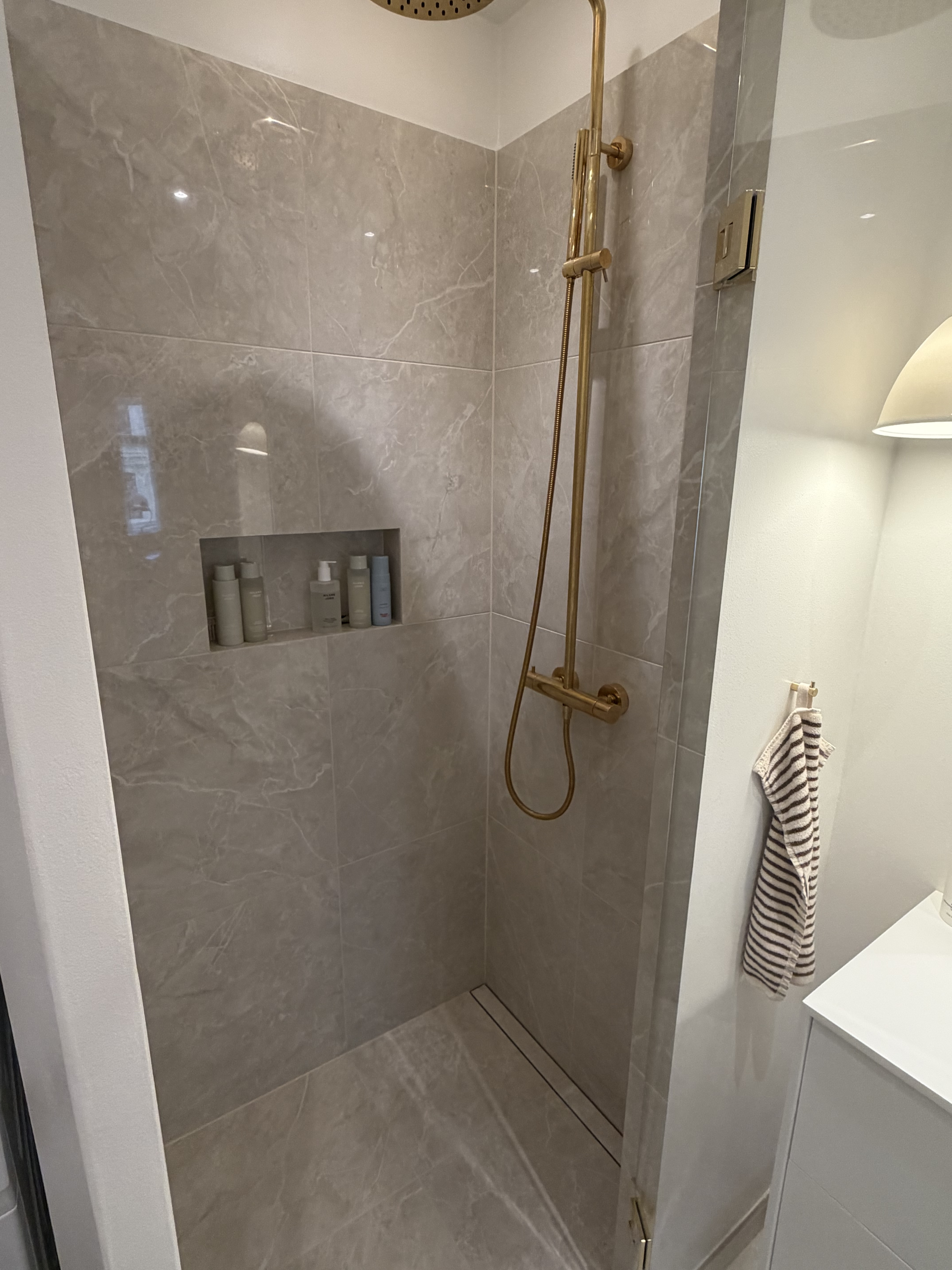 Nu, små to måneder senere, står vi tilbage med det smukkeste badeværelse. Gazmirs faglige stolthed, håndværk og sans for detaljer er i verdensklasse. Han leverer en service, som er sjælden at finde. Gennem hele projektet var han punktlig, kommunikerede godt og tog ansvar for hele processen – også koordineringen med VVS’er og elektriker. Da vi manglede gibspladder til et andet projekt i lejligheden og ikke har nogen bil, tilbød han at komme forbi med dem. Da vi havde malere i lejligheden, og der var meget fugtigt, kom han endda efter arbejde med en affugter efter arbejde. Det er blot nogle eksempler på, at Gazmir leverer en service, der går langt ud over det sædvanlige.