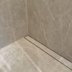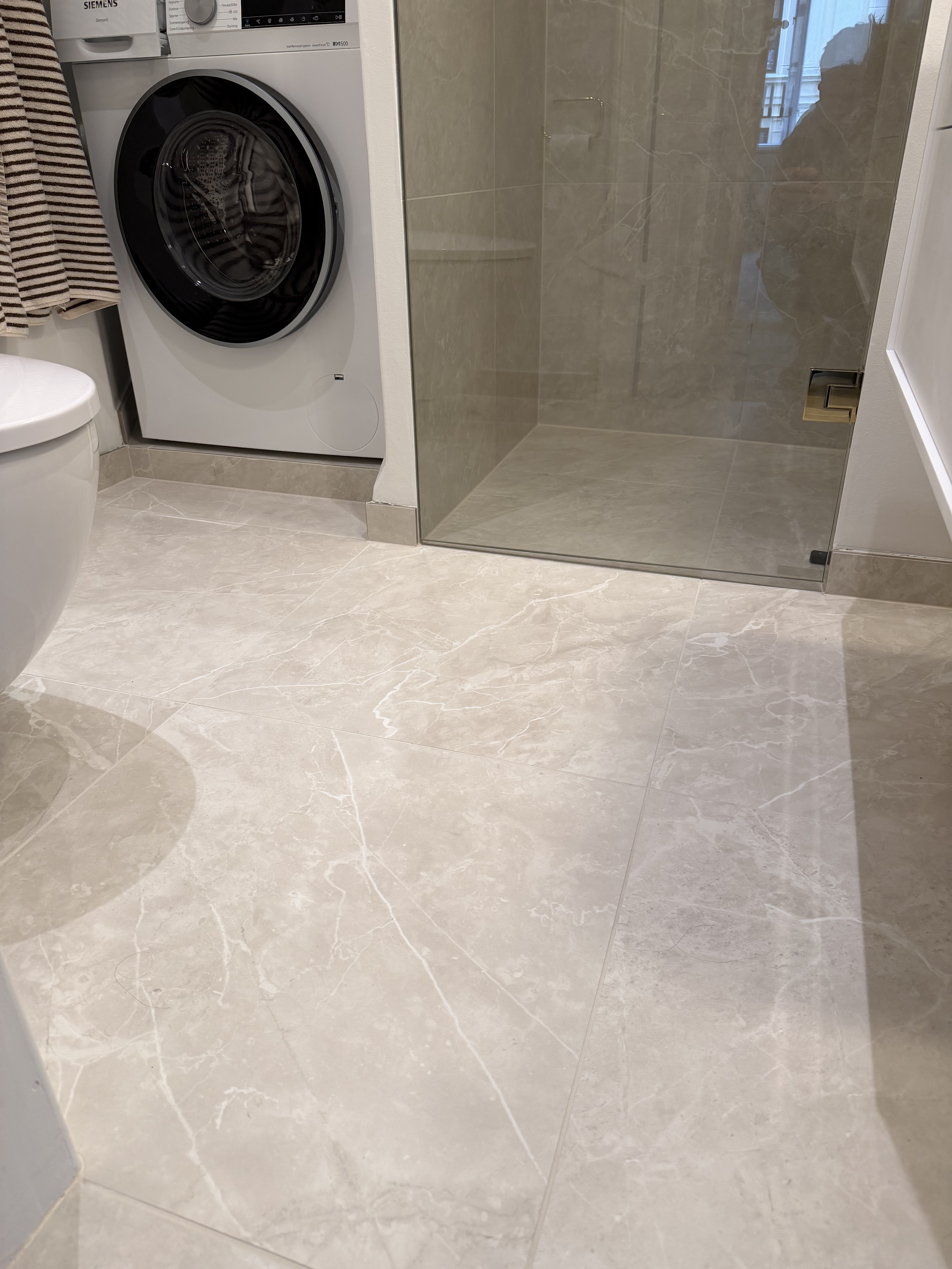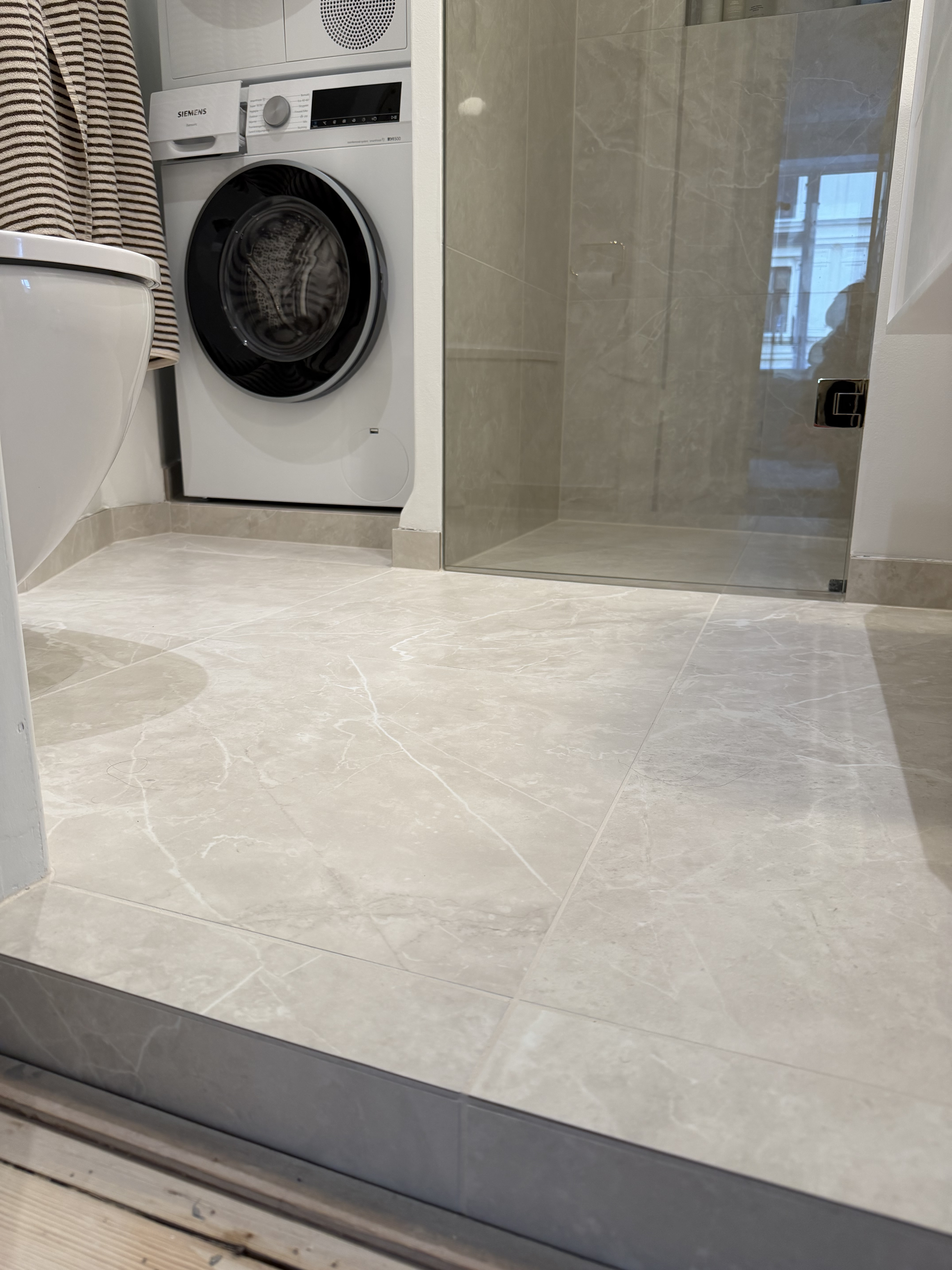 Vi valgte 60x60 fliser, hvoraf de fleste skulle skæres og mange af dem i smig ved kanter i samlinger.