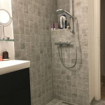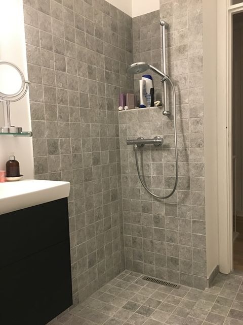 Der blev nedrevet et badekar og fliser samt konstrueret nyt gulv, med plads til bruseniche. Flise-arbejdet er virkeligt flot og i det hele taget er arbejdet meget veludført.