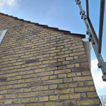 Udbedring af en større sætningsrevne over hoveddør op til 2. sals højde samt udbedring af halvtag over hoveddør