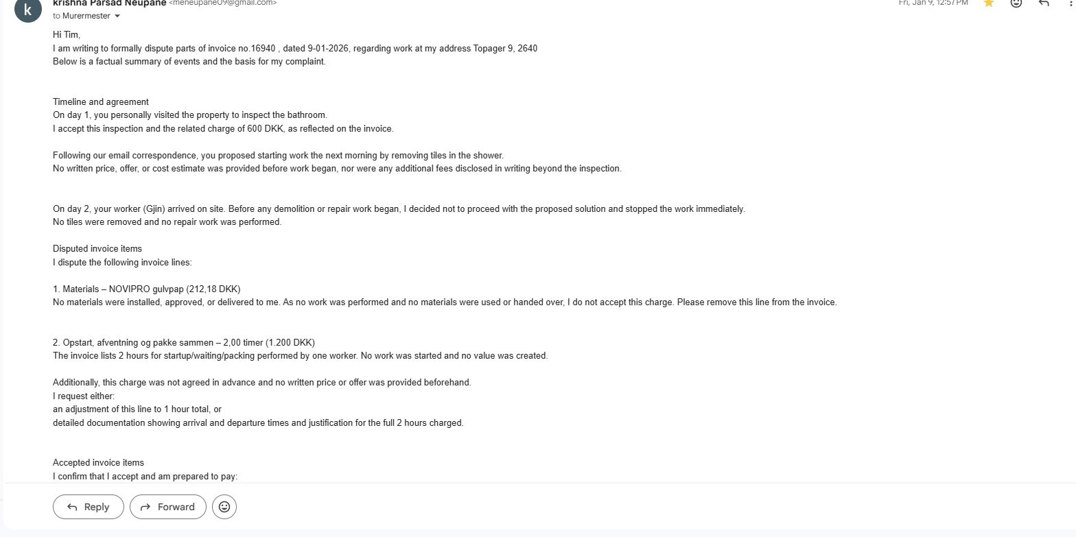 Senere modtog jeg en faktura, der inkluderede arbejdstid, servicebil og materialer, som ikke blev installeret. Jeg gjorde skriftligt indsigelse mod dele af fakturaen flere gange, men modtog ikke noget svar. I stedet modtog jeg rykkere med pålagte gebyrer. Til sidst valgte jeg at betale det fulde beløb for at undgå yderligere stress.