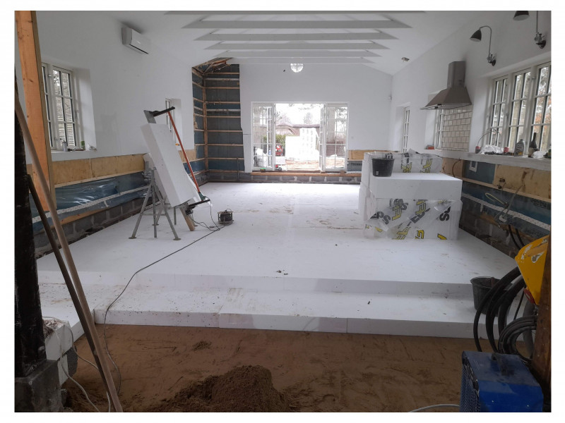 Steffen har stået for nedrivning af alt indvendigt og har derefter lagt ny isolering samt støbt nye gulve. Derudover har han renoveret mange vægge, indstøbt en brændeovn med gamle flotte genbrugssten og lerpudset en gammel væg, som vi fandt bag gammelt tapet m.m.