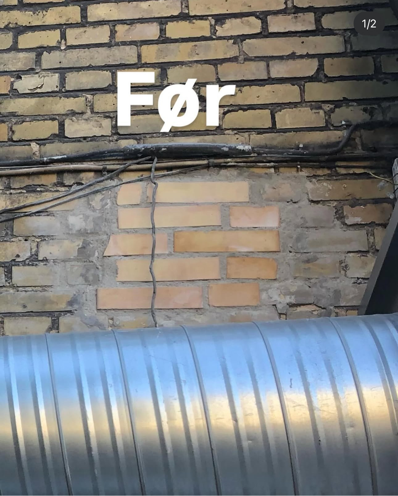 De to murere fik klaret det hele på én dag. De tog de gamle mursten ud, rensede området og lagde nye mursten. Dagen efter kom de igen og gav en sort behandling, så man næsten ikke kan se, at stenene er nye.