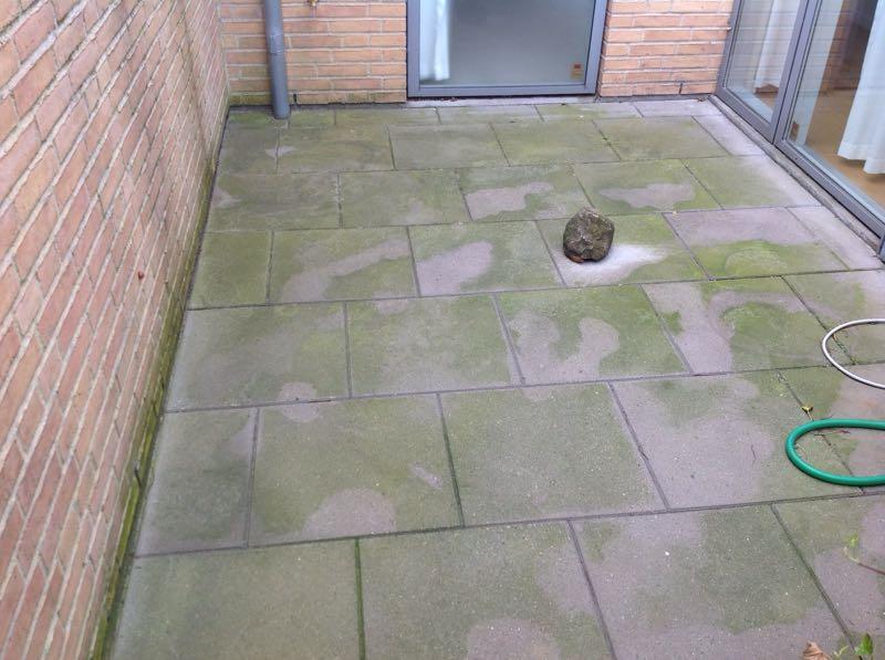 Rensning og algebehandling af træterrasse, rensning, algebehandling og imprægnering af fliser samt algebehandling af tag.