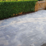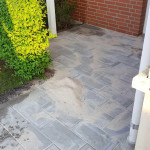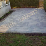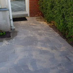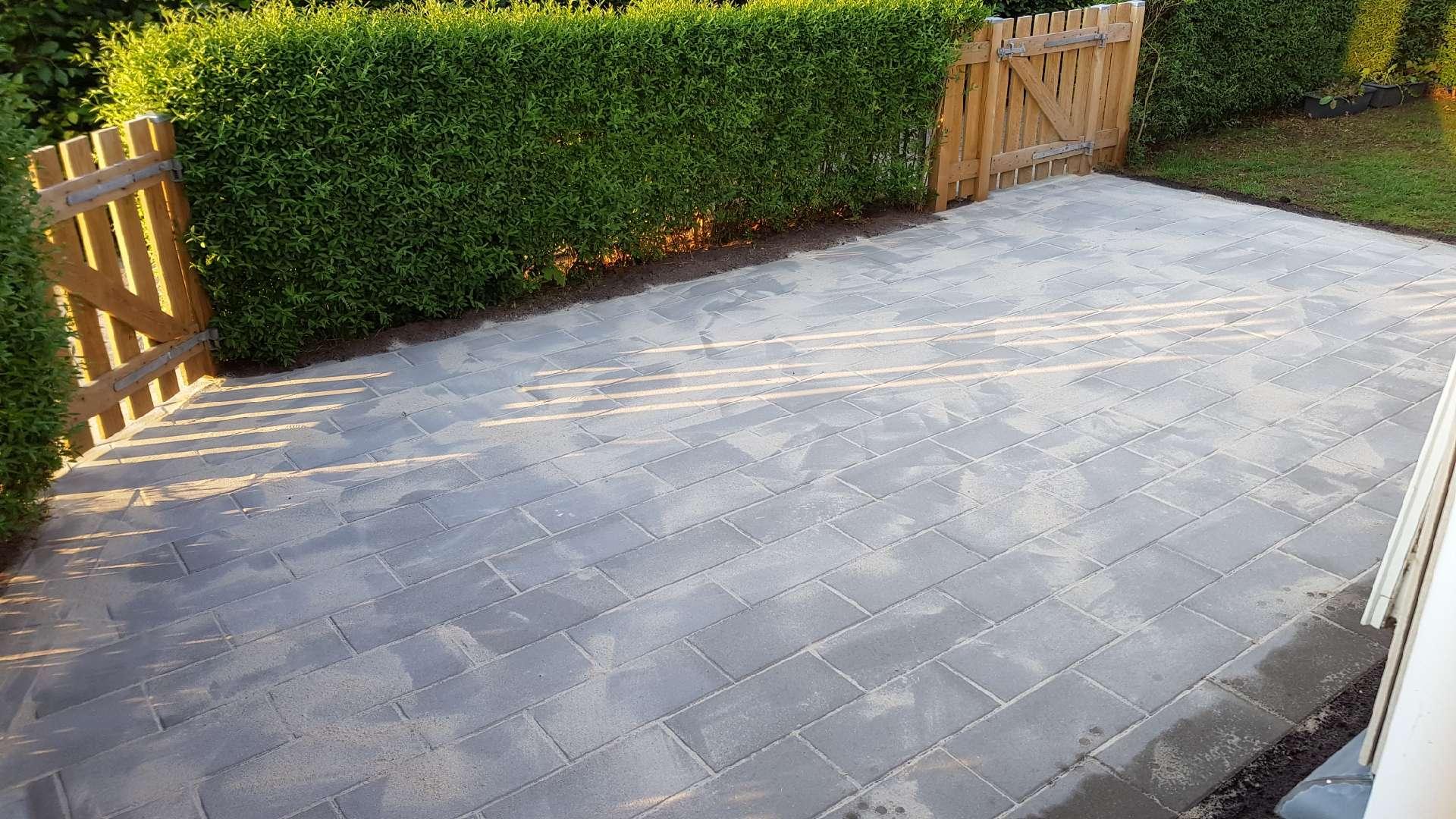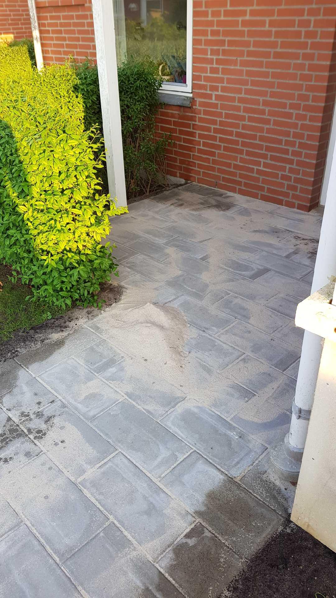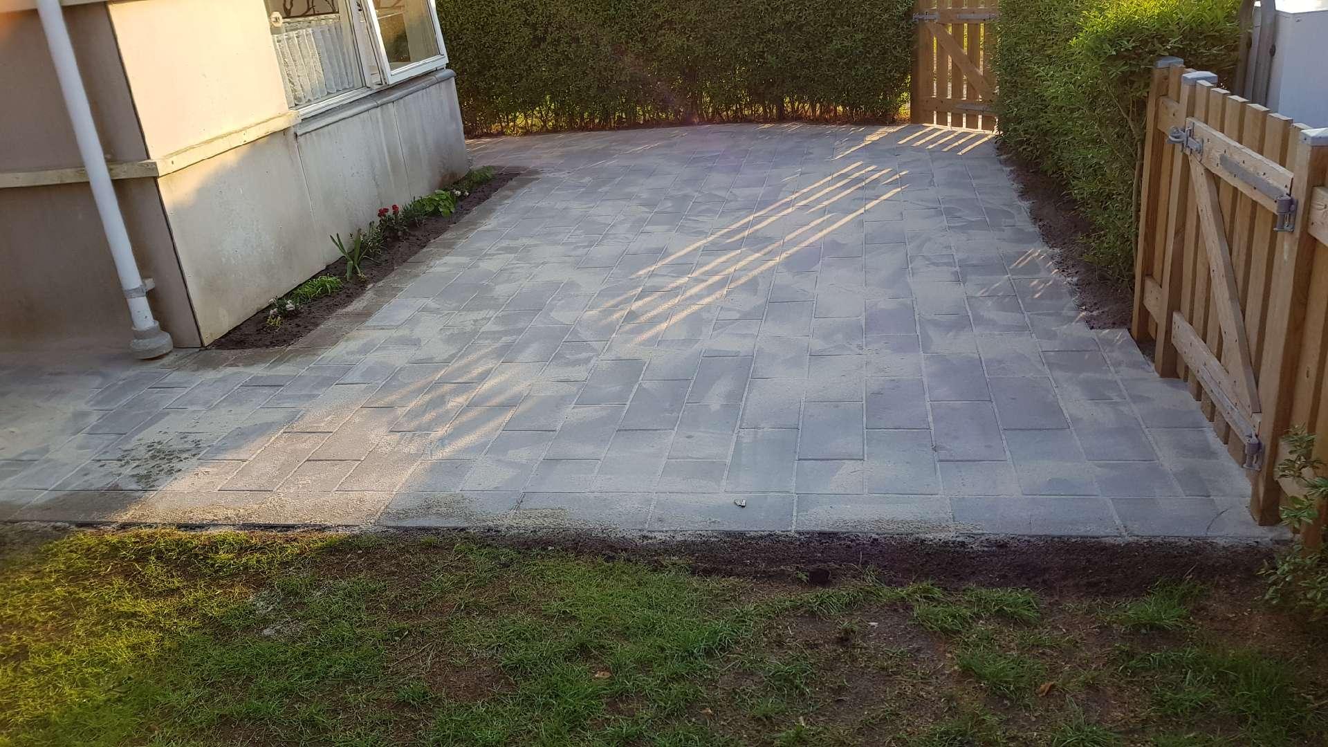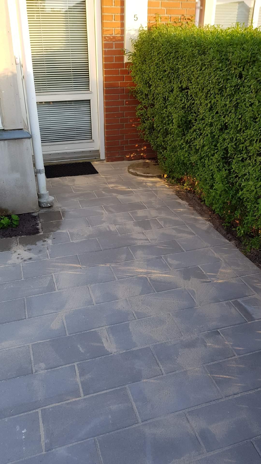 Anlagt indgangsparti og terrasse i forhaven.