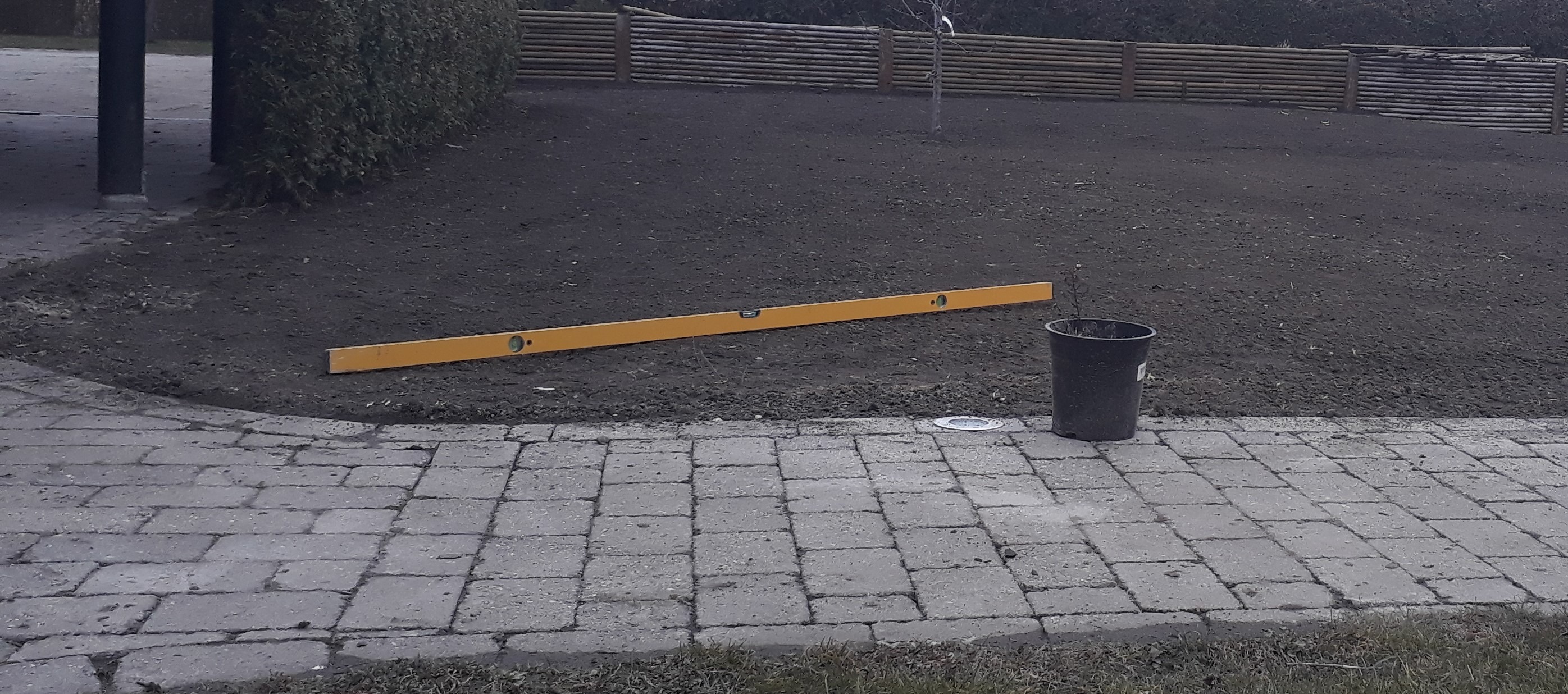 Jeg blev oplyst om, at det færdige arbejde ville fremstå helt lige. Græsset er anlagt, så det skrider i 3 forskellige retninger.