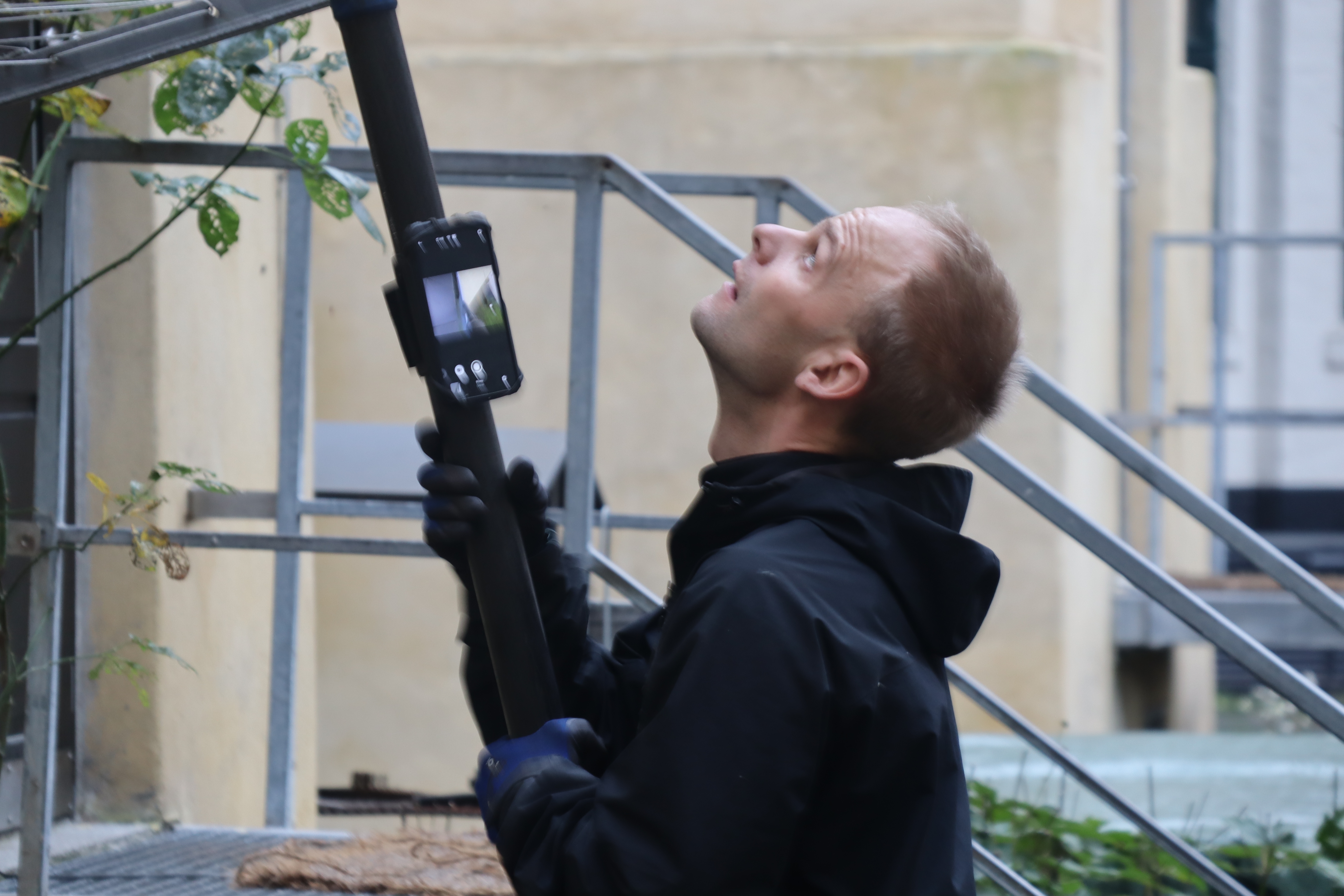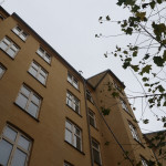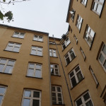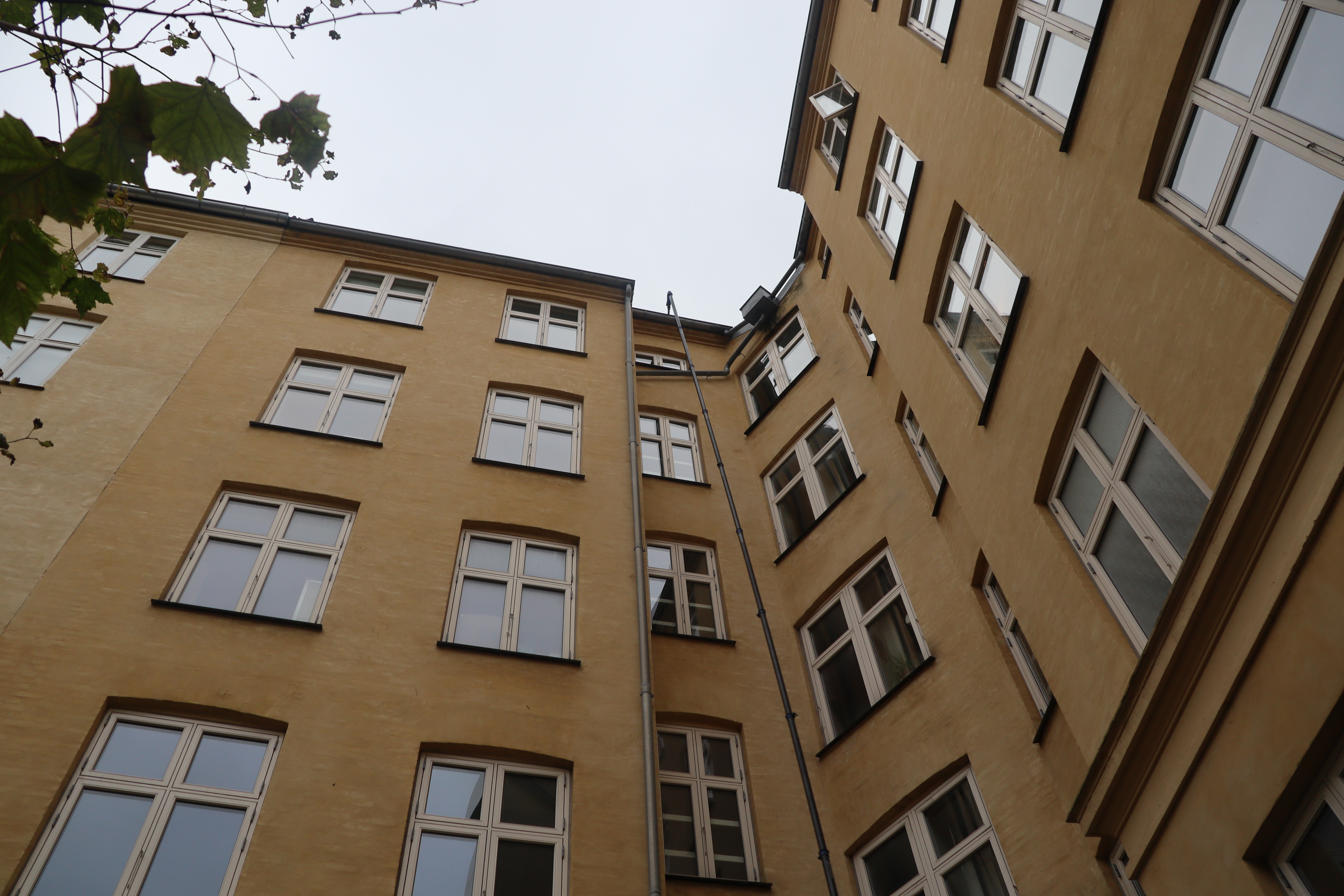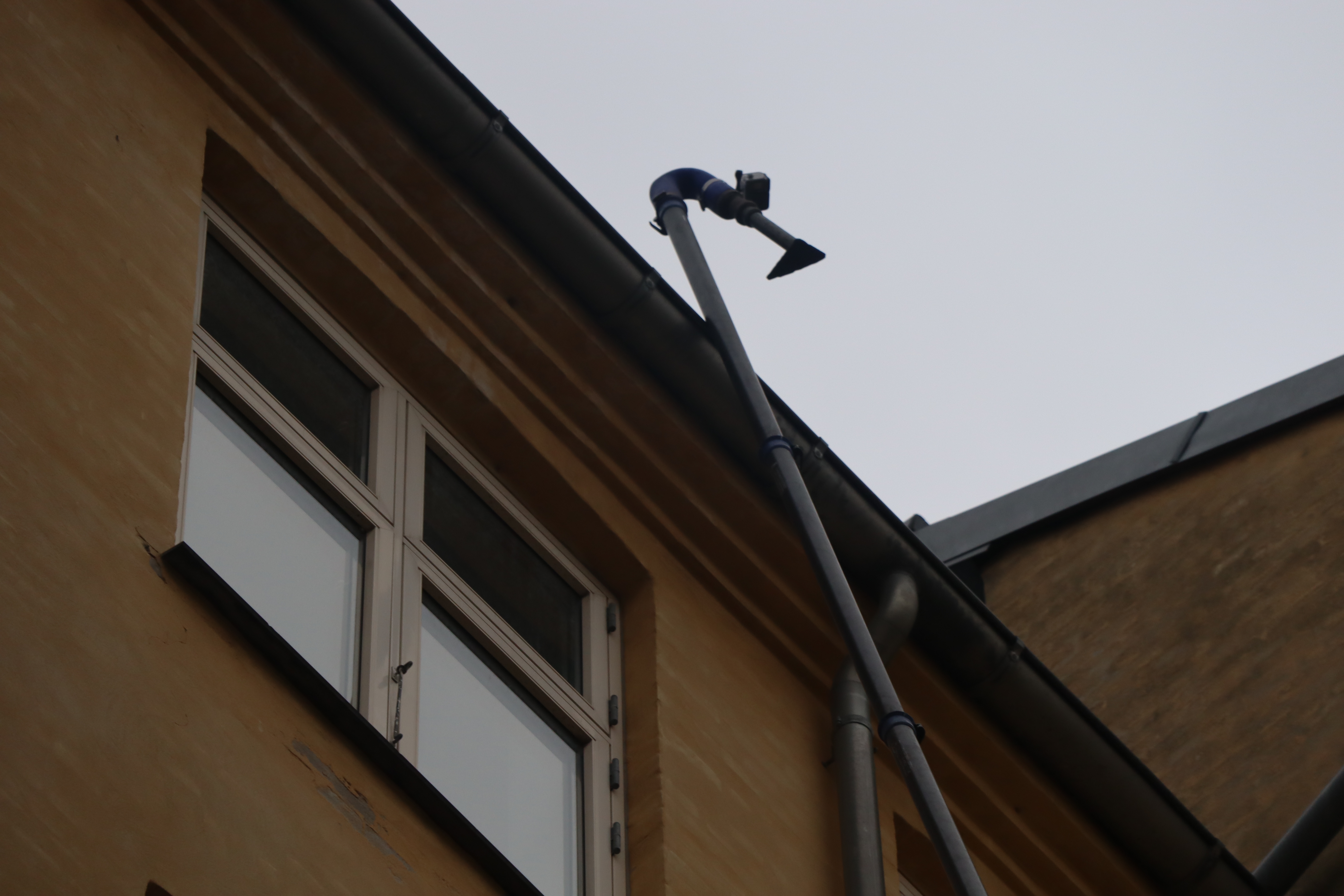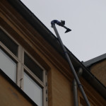 Renset tagrender på bagsiden af 5 etagers bygning.