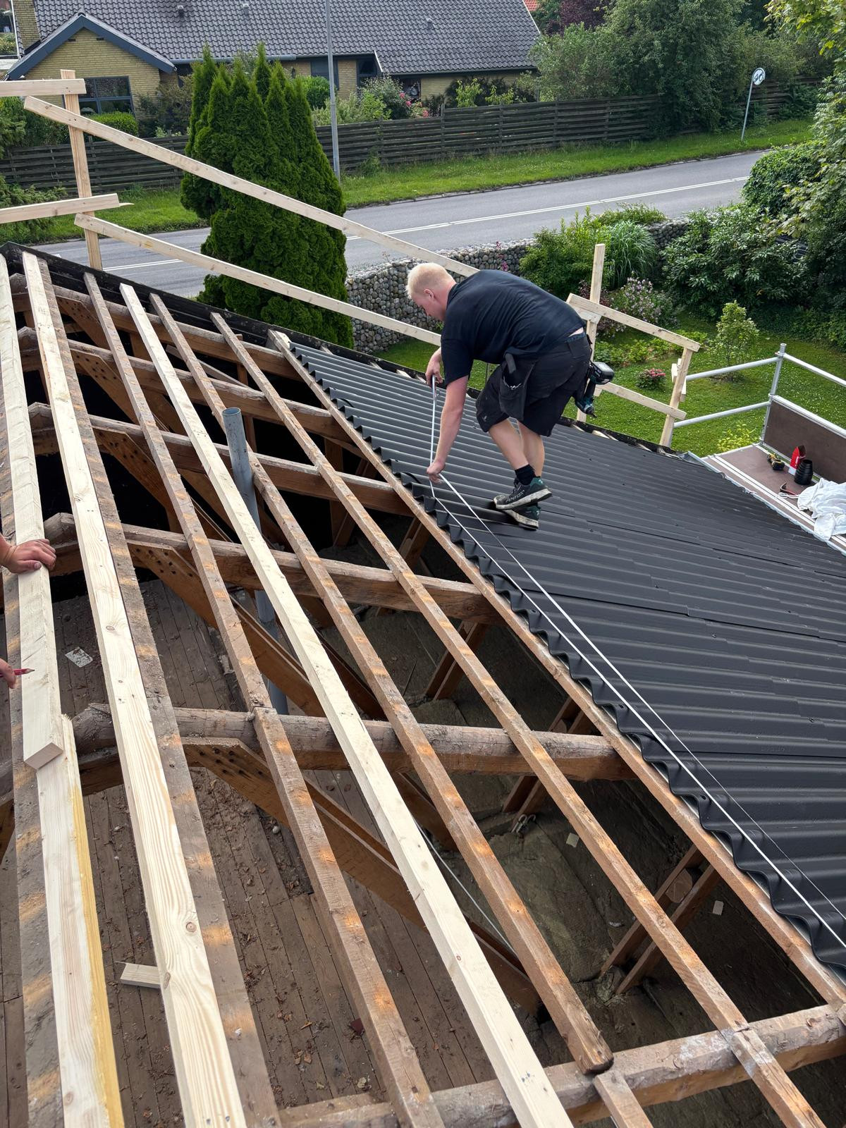 Det var fantastisk de kom mandag morgen og satte stillads op og og begynte på taget onsdag formiddag havde de pakket det hele sammen igen og ryddet op fantastisk oplevelse jeg nyder at se på mit tag nu