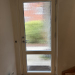 Tømrerne var ihærdige og kvalitetsbevidste, da de monterede den nye hoveddør. Og de ryddede pænt op efter de var færdige med monteringen af hovedøren.