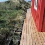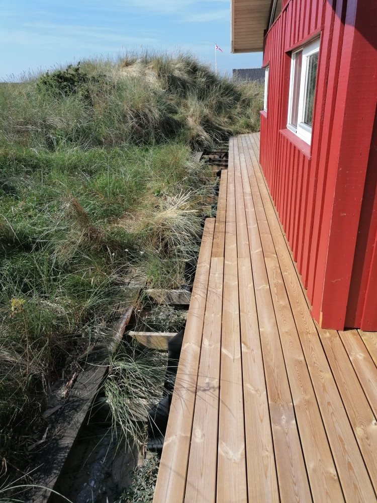 Vi er en tømmerhandel på Sjælland der har et sommerhus i Nørrelev Strand som fik lavet en træ terrasse på godt 100 m2 med opstart april hvor alle brædder blev fjernet fik lovning på at den stod færdig i uge 20 -21 da huset var lejet ud der fra og til uge 38 og den er pt ikke færdig men regning er sendt frem og betalt, og det har vi da fortrudt, men aftalen var at de sidste 4 rækker brædder & skæringer blev lavet dagen efter (start juli) efter den modtaget regning, man kan ikke stole på ham for alle mulige undskyldninger for ikke den er færdig som aftalt uge 26 håndværksmæssigt er der ikke meget at råbe hurra over skruer er ikke skruet helt i, samlinger over ender springer,