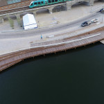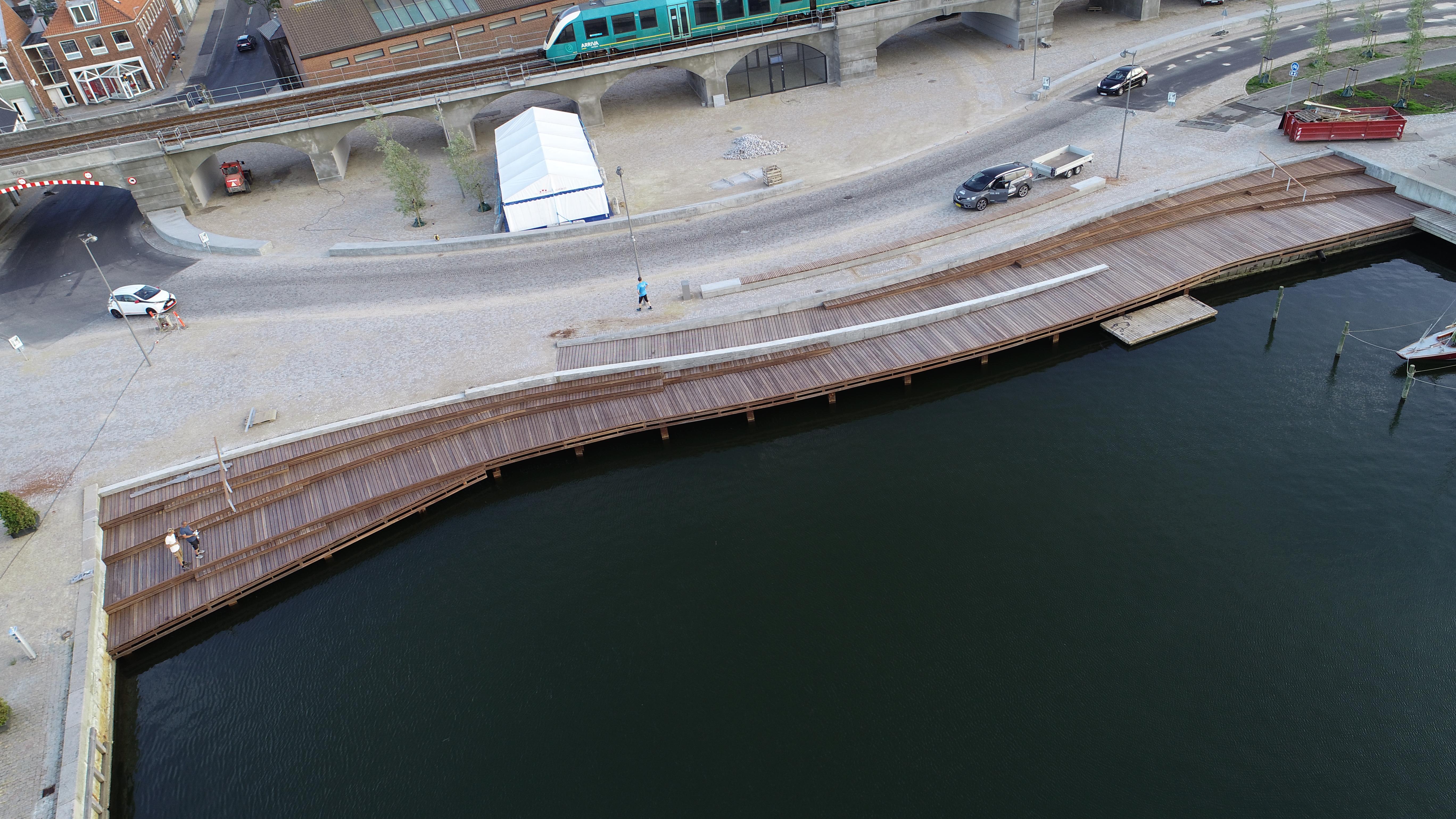 Der er udført en flot træpromenade i azobé træ, samt en containerskærm og 3 bænke udført i mahogni.