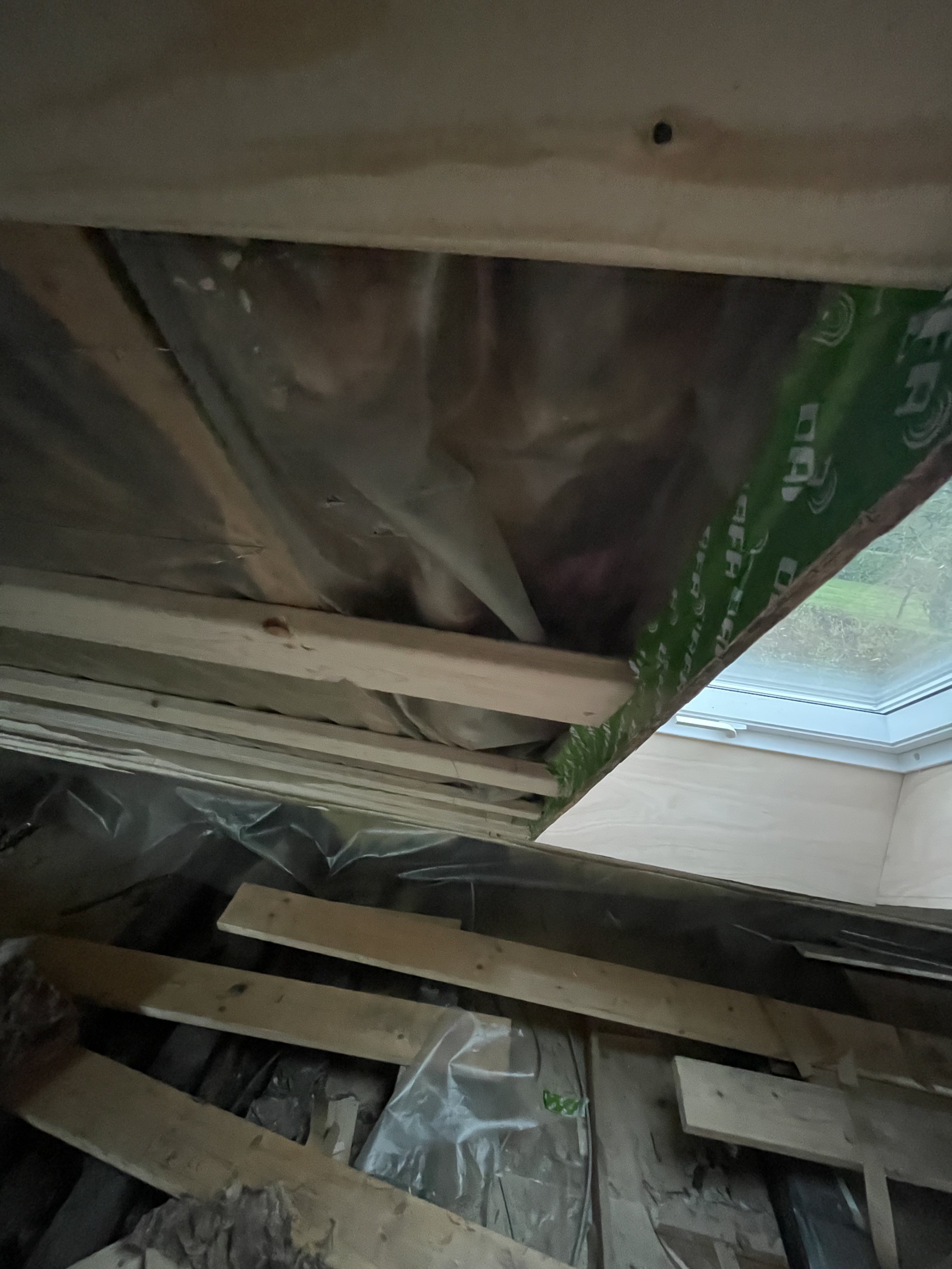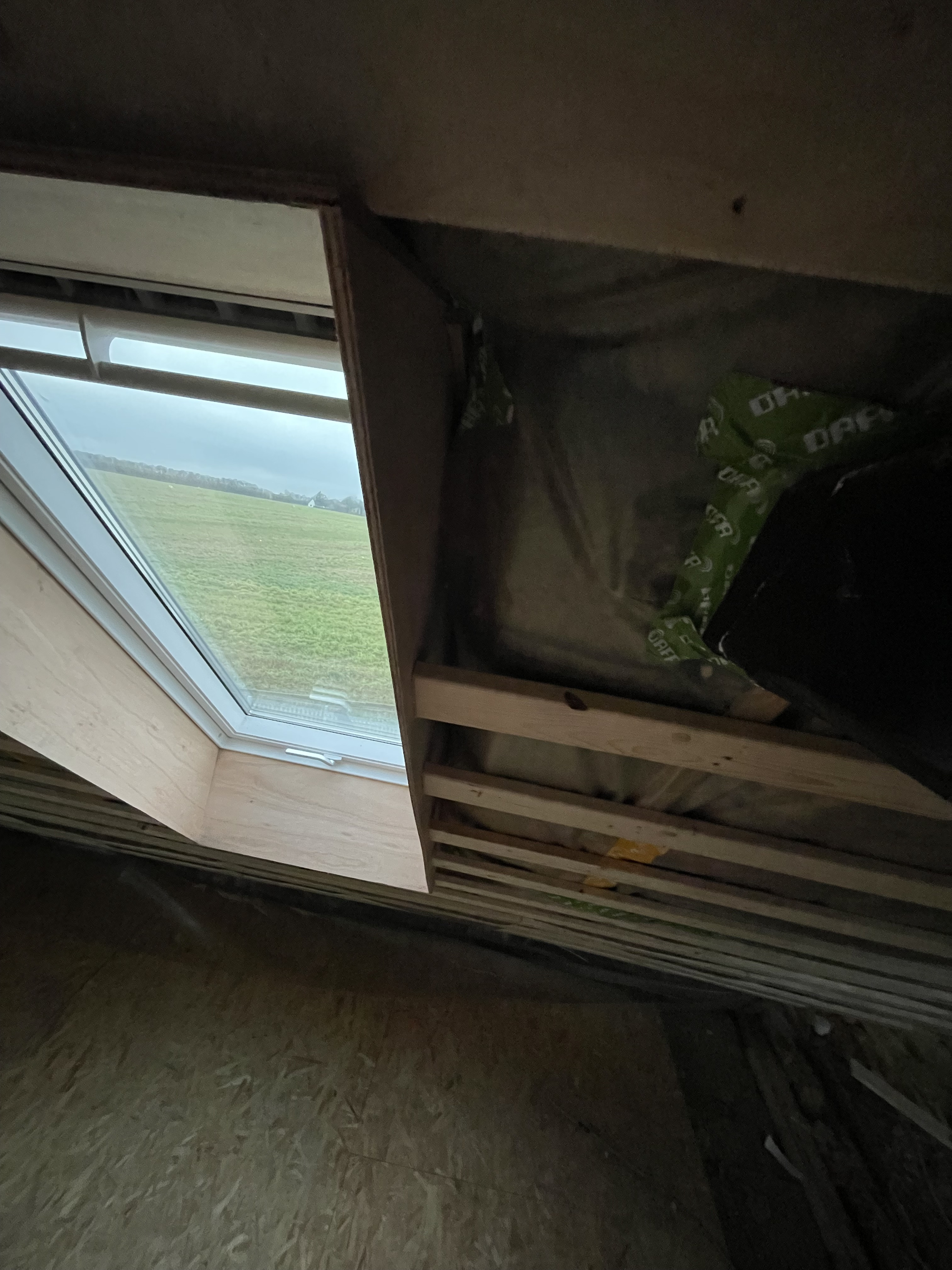 Isoleringsarbejde. Opsæt af dampspærre, opsæt af forskalling. Lysninger til skråvinduer.