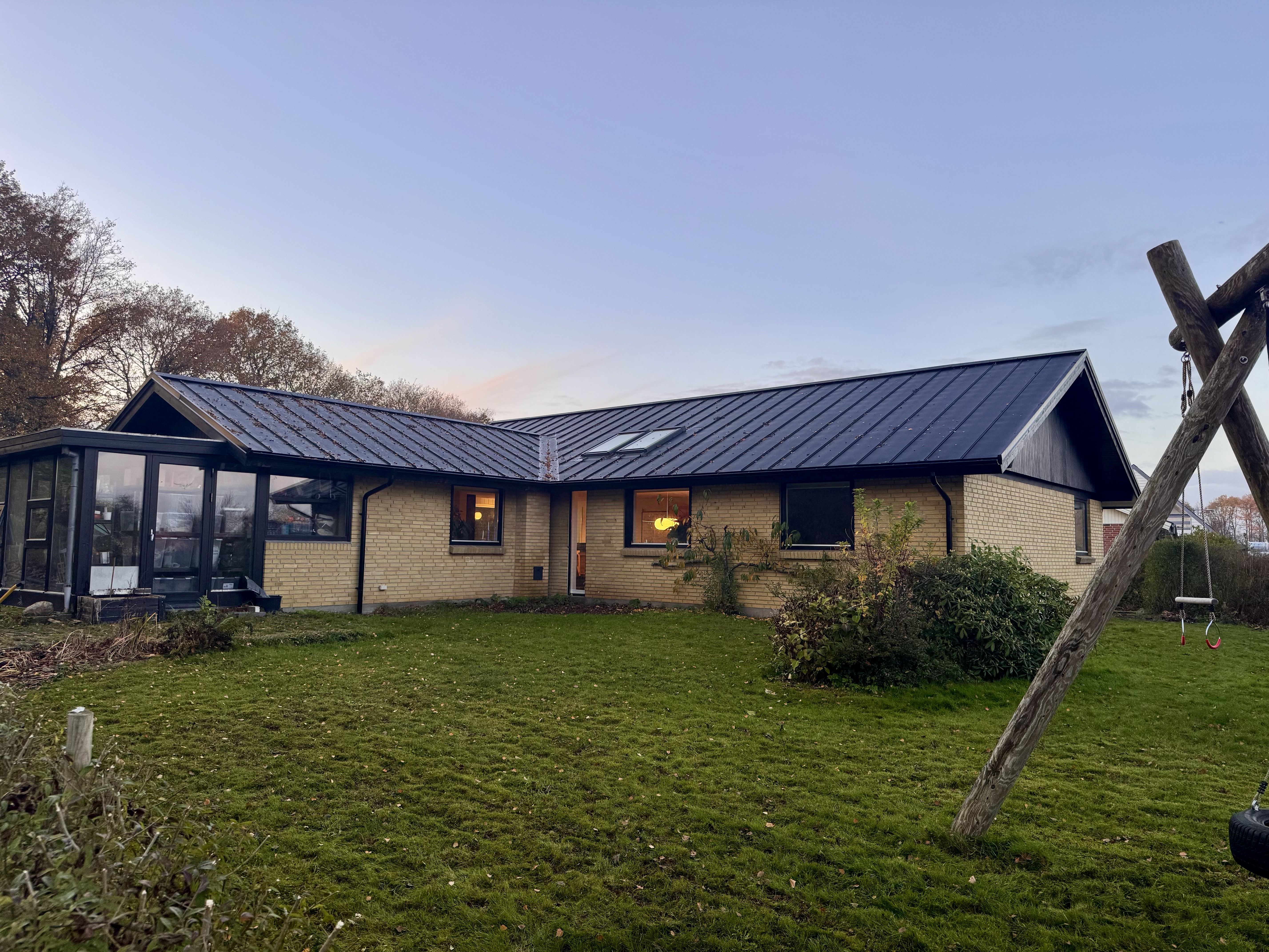 NJ Byg har netop færdiggjort montering af vores nye tag. De har stået for alt fra at pille det gamle asbest-/eternittag ned, montering af nye ovenlysvinduer inkl. lyskasse til montering af nyt tag. Vi valgte et ståltag med klikfals fra Areco, og resultatet er blevet super godt.