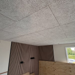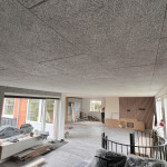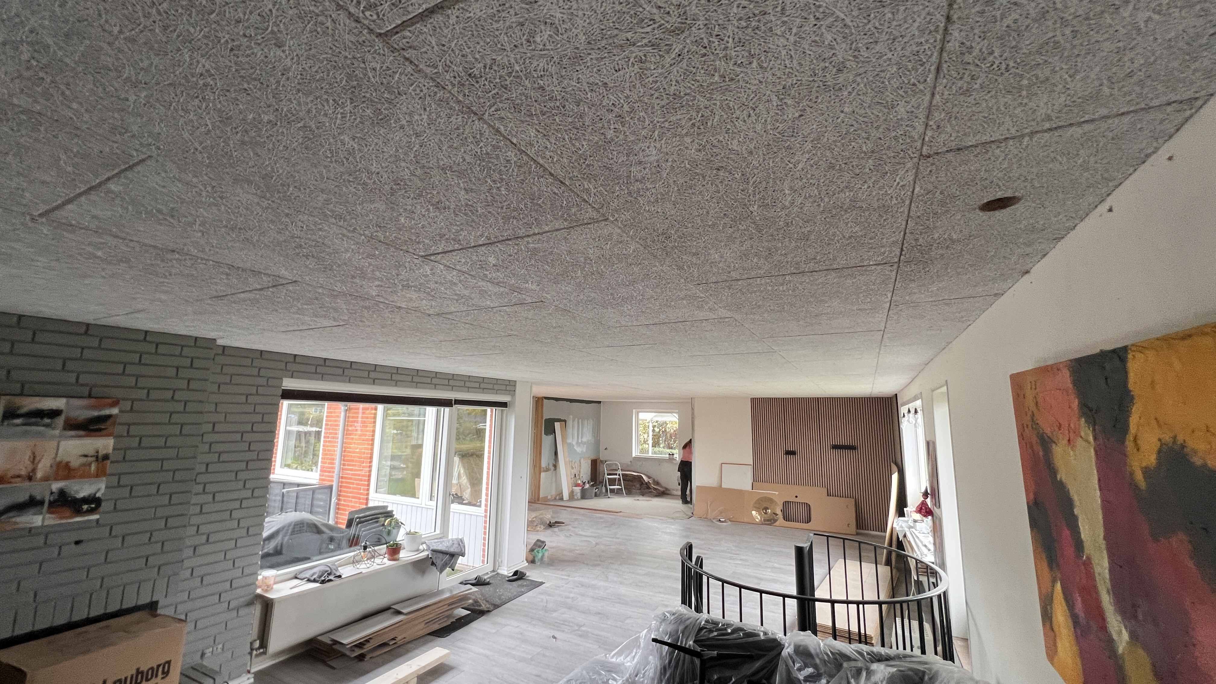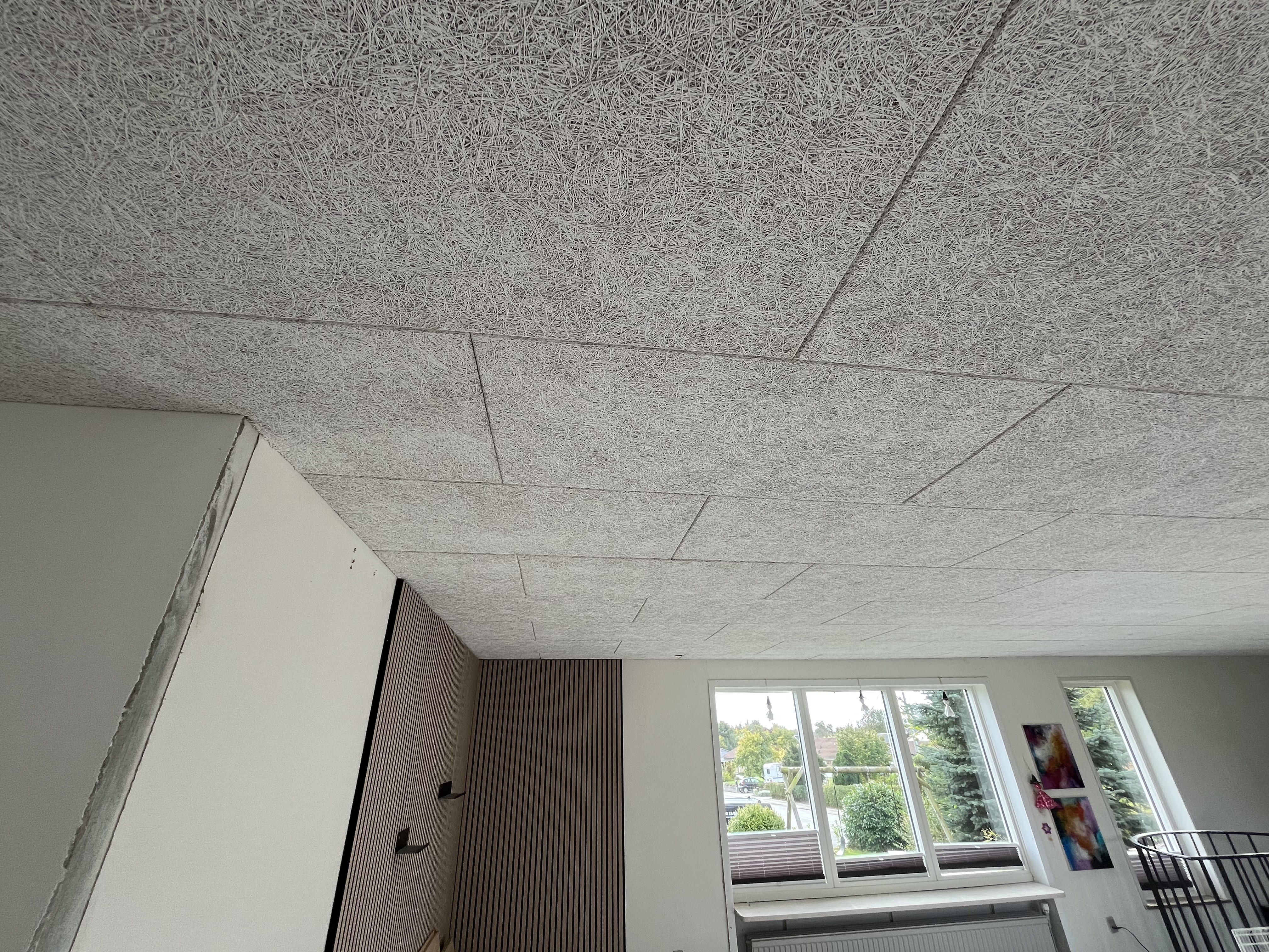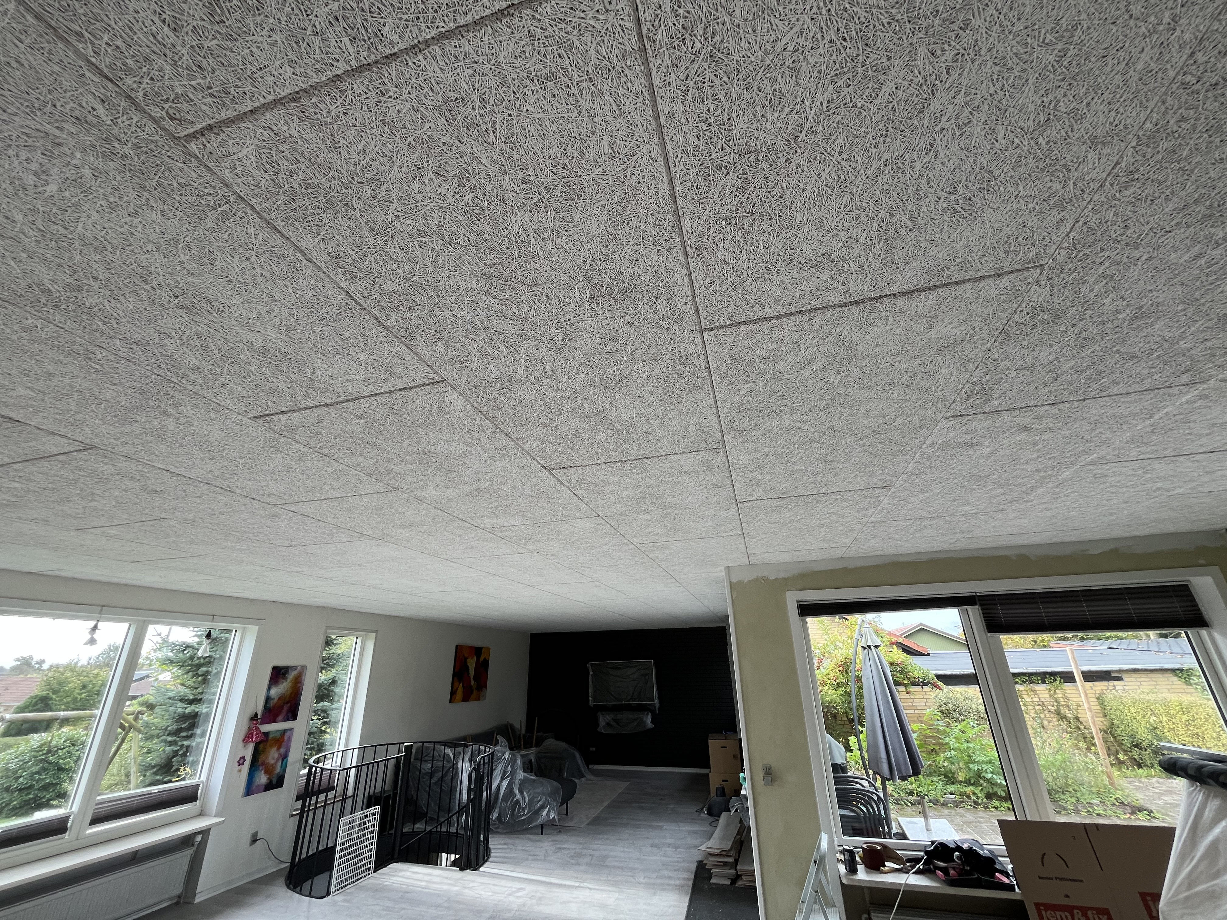 Nyt troldtekt loft i stue og køkken. Nedlægning af væg mellem to rum. Reparation af væg og gulv efter nedlægning af væg.