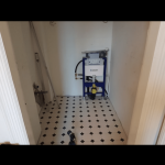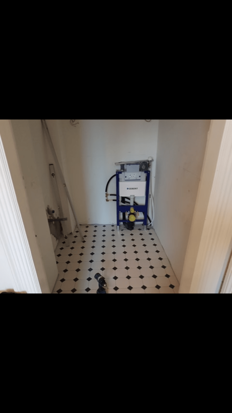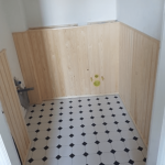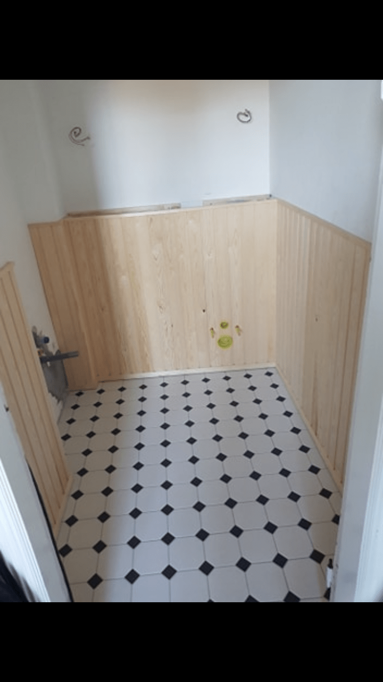 Gæstetoilet med vvs, fliser, panel, malning og tapet