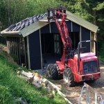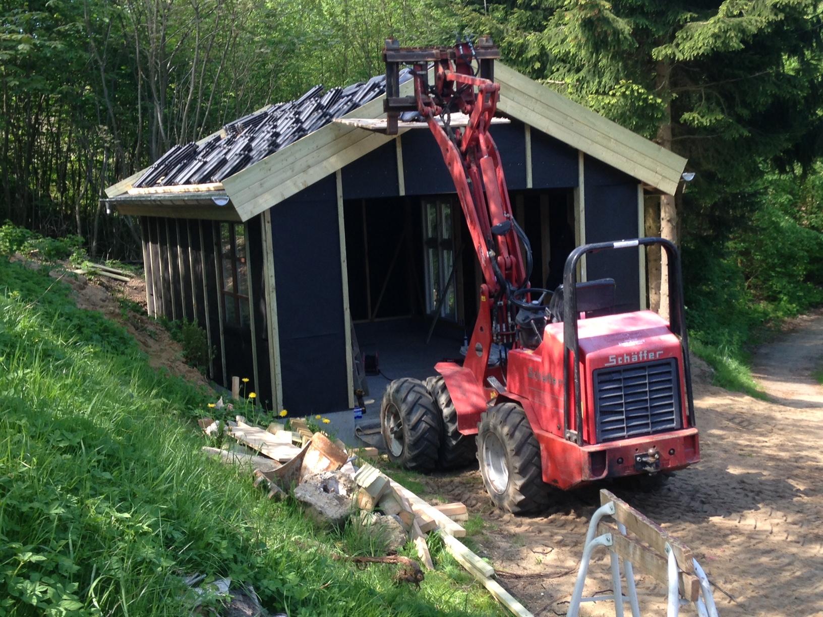 Fundament ved tilknyttet murer, isoleret betongulv ,bygningen af træ, isoreret, tag m 30 gr hæld, kraftig overrem, stolper 10x10, 2 vinduer, det ene magnonie. Port og rampe og maling står bygherren selv for.