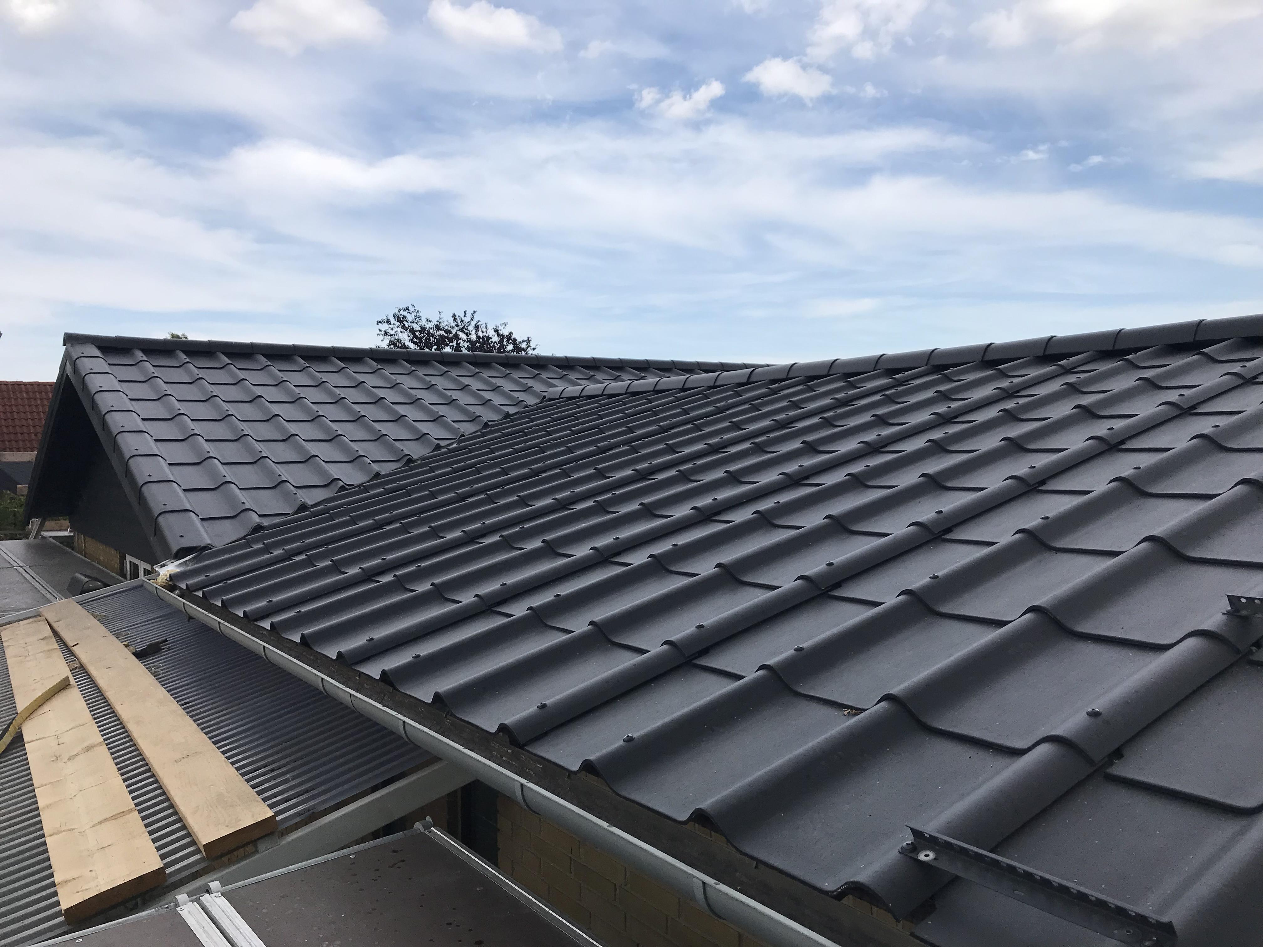 Vi fik udskiftet vores gamle 60/70’er tag med et nyt Cembrit Toscana tag med vedligeholdelsesfri vindskeder og gavle. Endvidere blev garagetaget udskiftet til et nyt tag med tagpap. Alt sammen blev klaret inden for den aftalte tidsramme og håndværkerne var utroligt venlige, høflige og behagelige at ha’ gående. Resultatet blev fuld ud som forventet og vi er utroligt glade for at vi valgte Hammer Bakker I/S til at udføre opgaven.