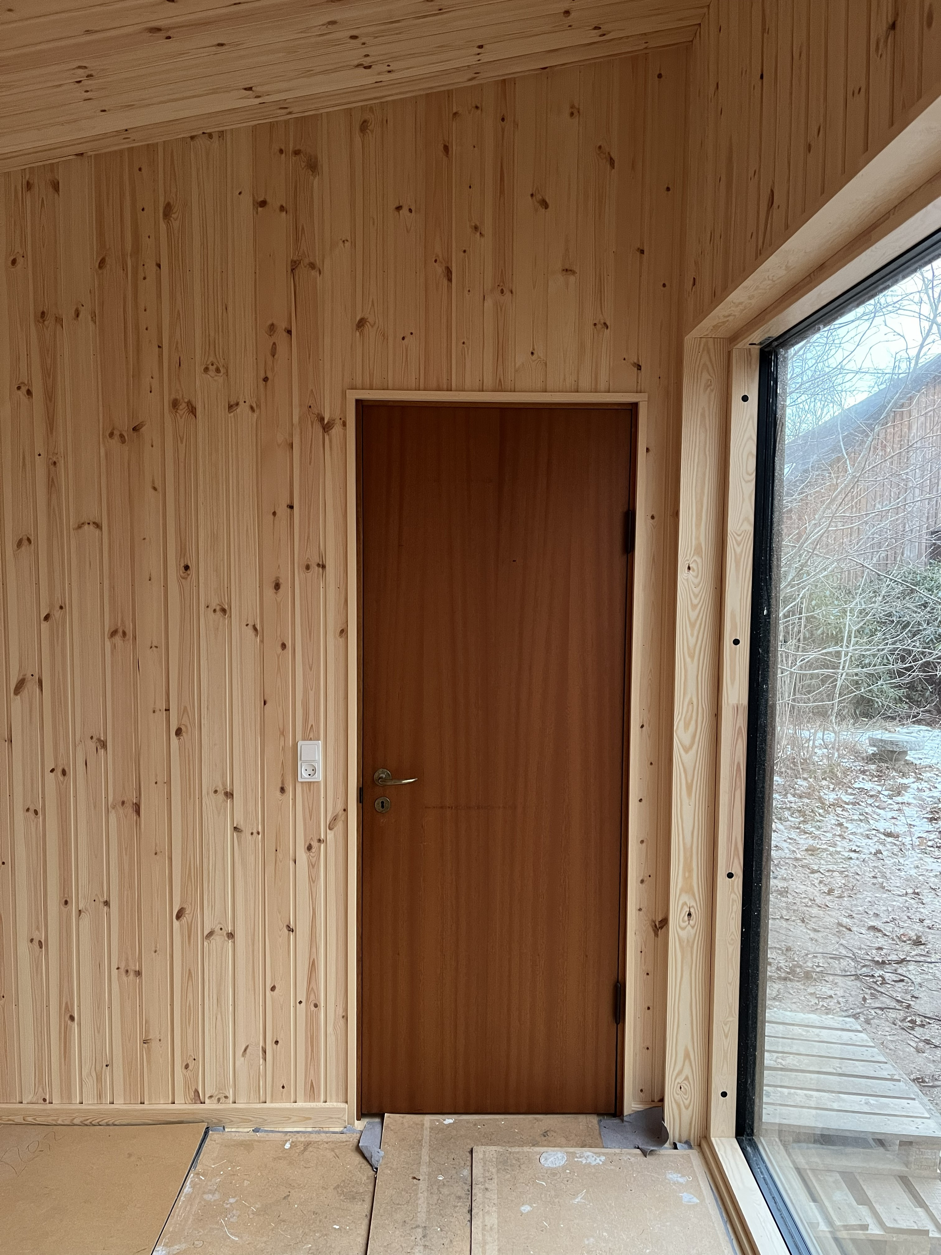 Rasmus fjerne gamle gulve og en gipsvæg, lagde nye trægulve og satte ny gipsvæg op i vinteren 2021.