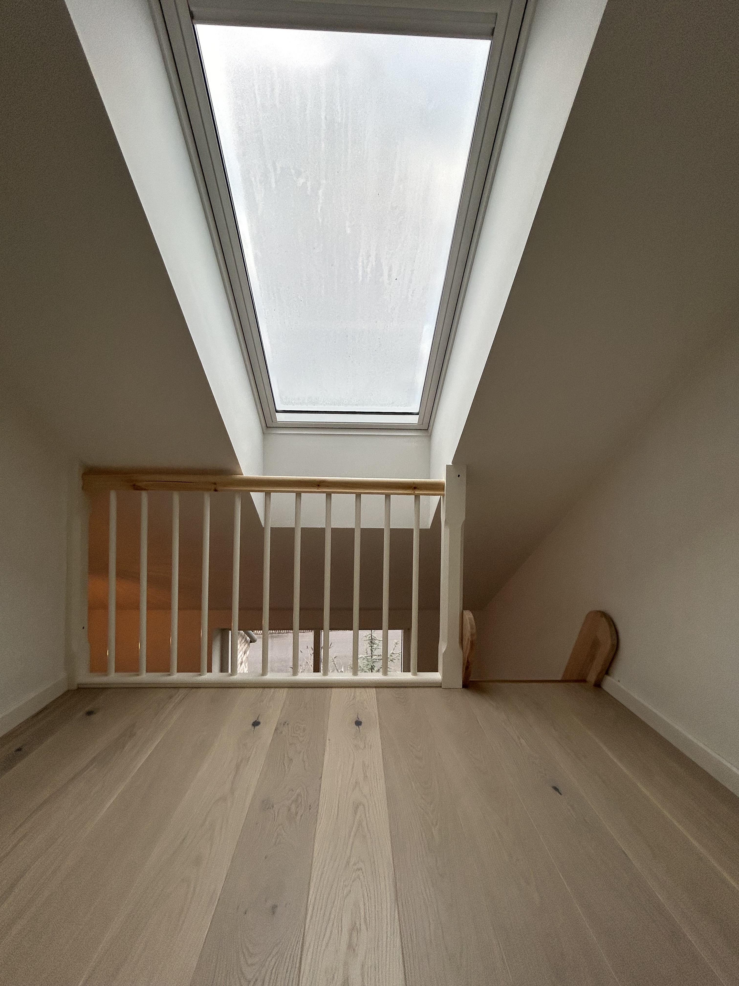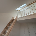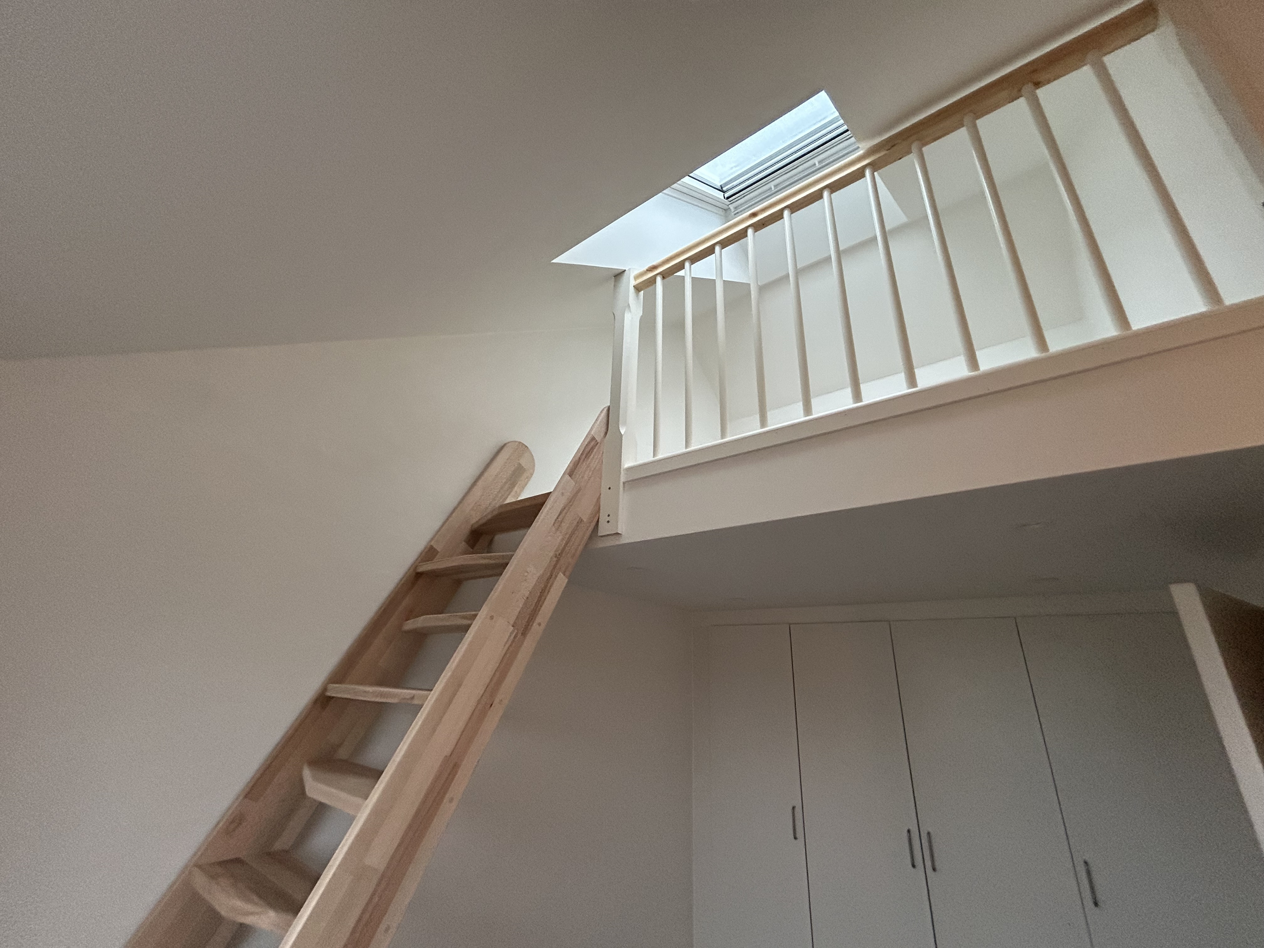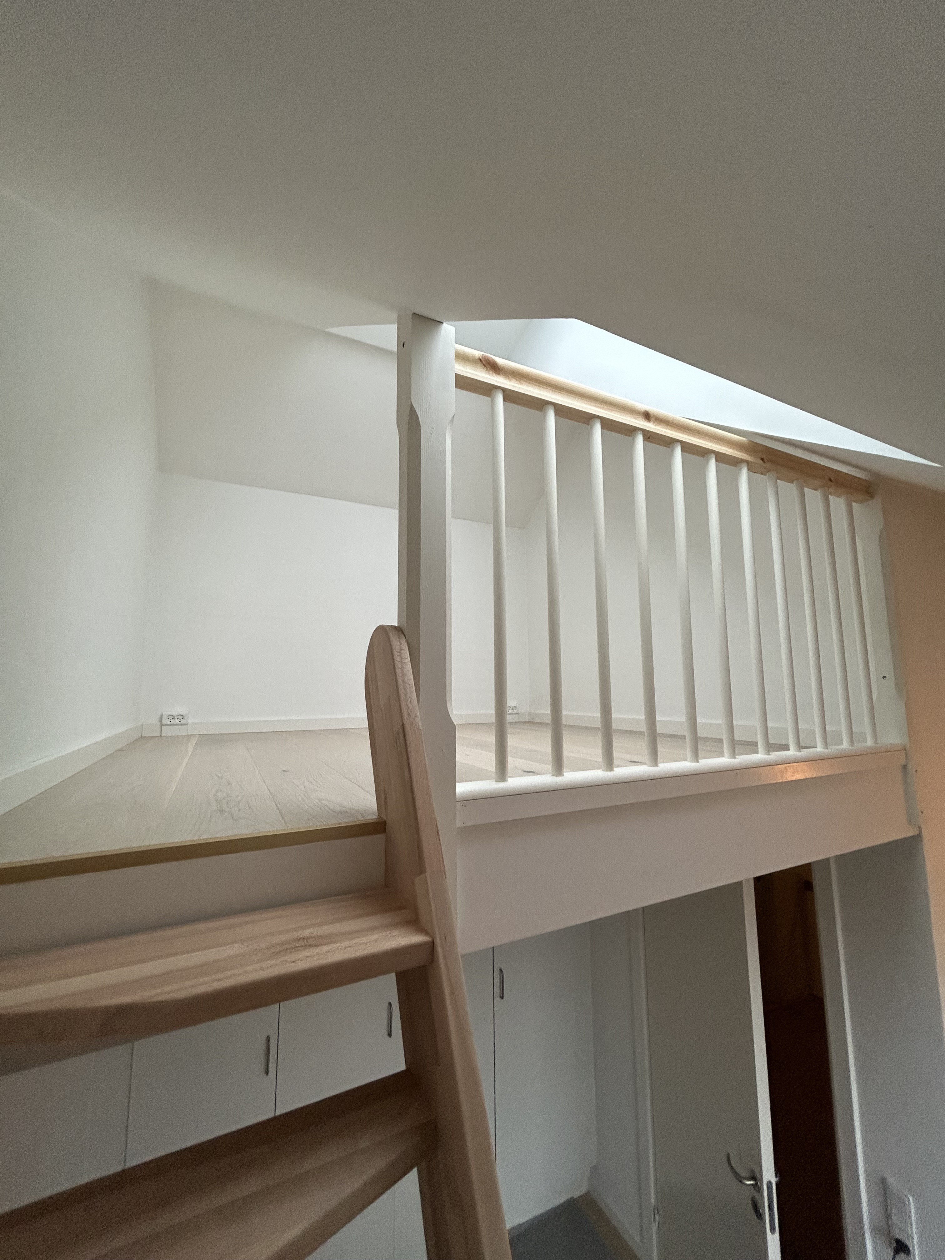 Vi fik lavet 1. Sal med omlægning af gulv på nye spånplader som undergulv. Opsætning af gelænder, Hemsestige og bordplade. Indbygning af skabe.