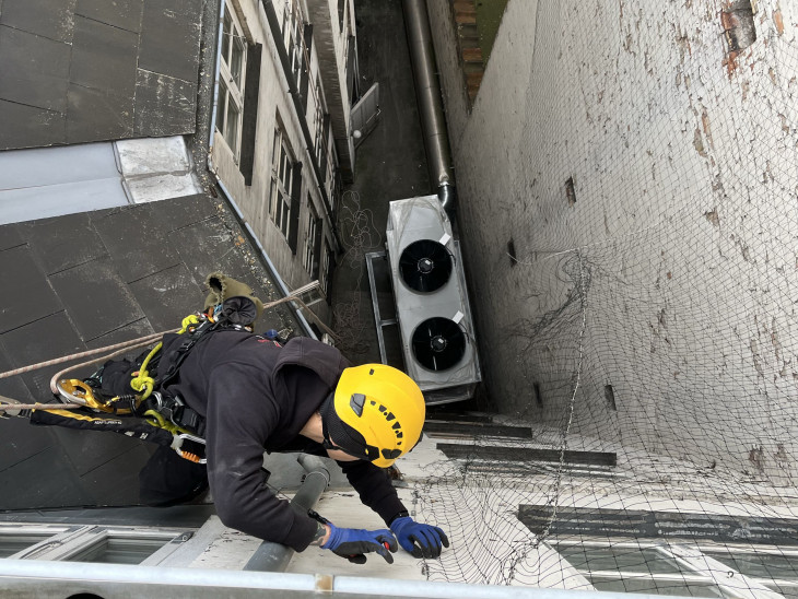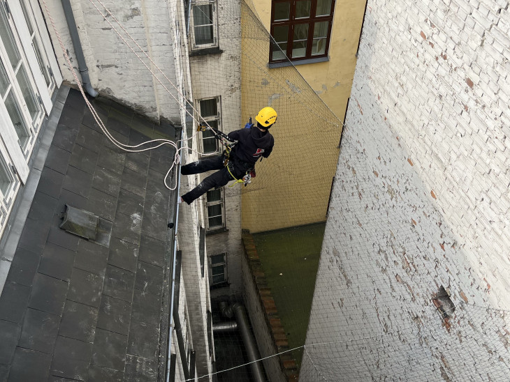 Industrial Climbing Solutions ApS , blev af os om at assistere med nedtagning og reetablering af et duenet i 5. sals højde.