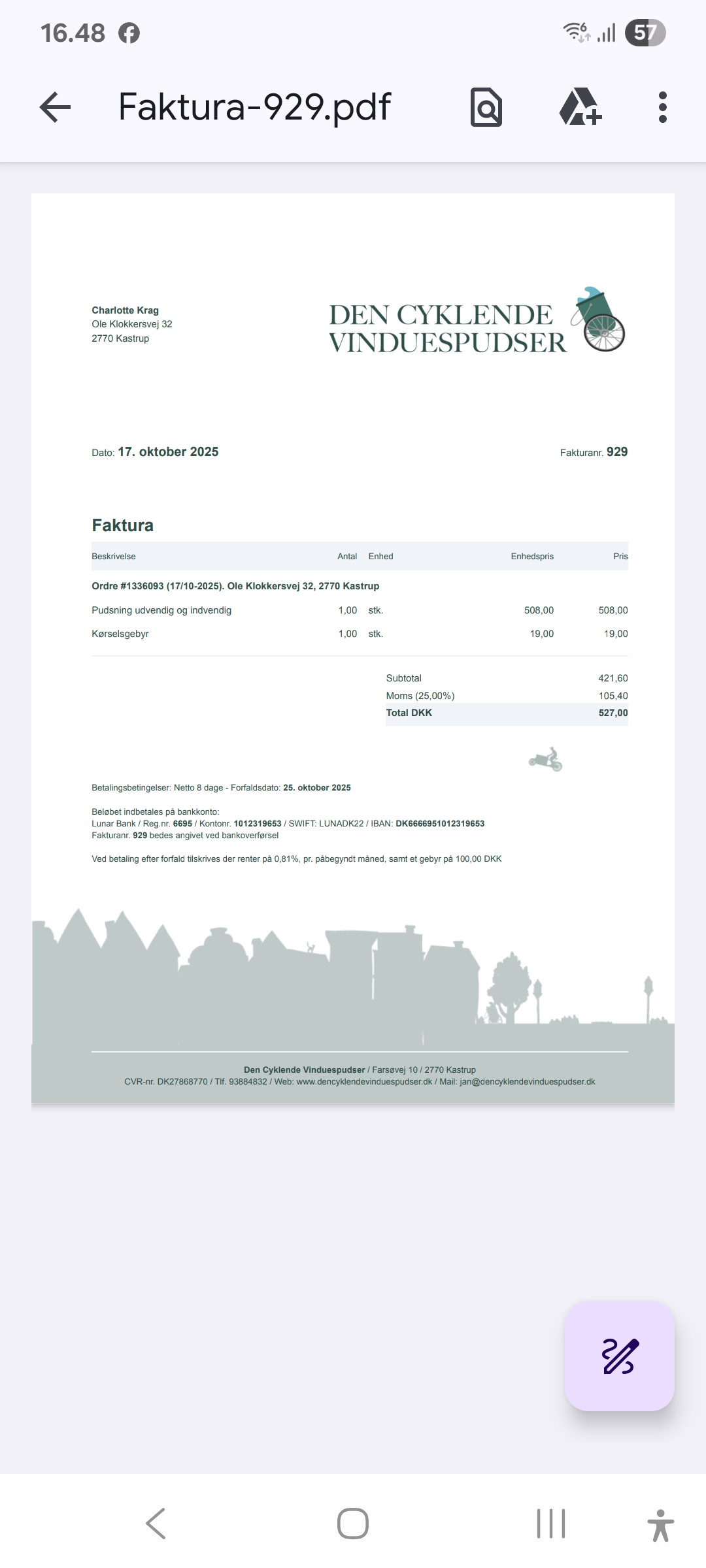 Jeg har fået pudset mine vinduer. Det betyder meget for mig at når man har aftalt en tid, så holder man den og det gør den cyklende vinduespudser til bravour.