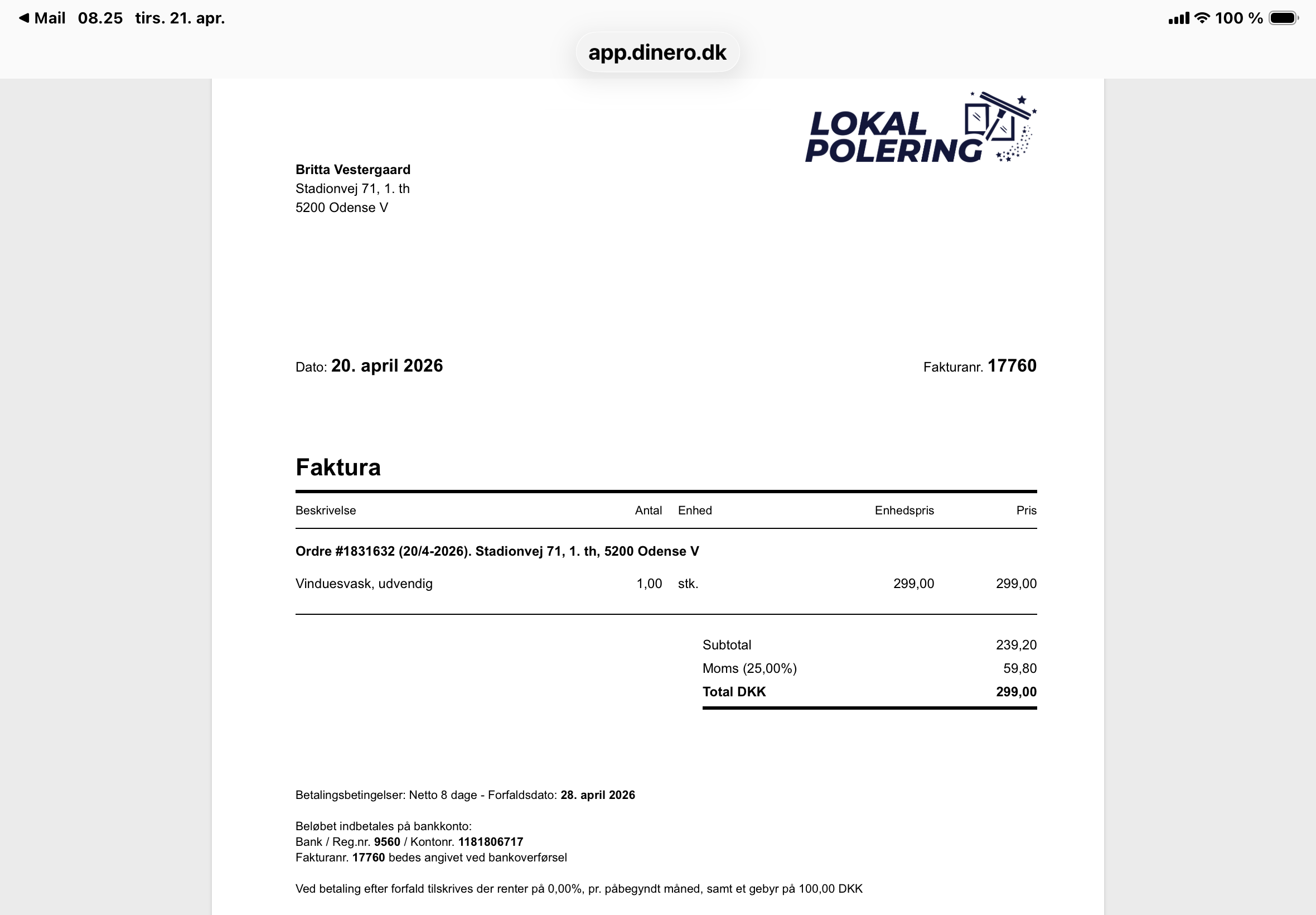 Ud- og indvendig vinduespudsning af alle vinduer, udvendig med aftørring hele vejen rundt af rammen. Derudover lidt ekstra indvendigt, da der var en del slemme pletter, som kom af. Hurtig og effektivt arbejde - og et meget flot resultat. Vi er meget tilfredse og har allerede lavet en fast aftale med Mikkel fra Lokalpolering.