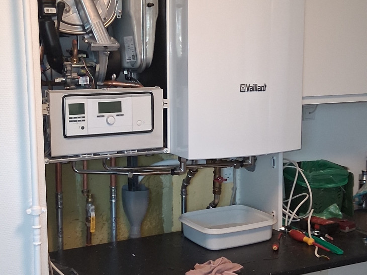 Udskiftning af varme unit til varmt vand, der efterfølgende var uæt som blev udbedret
